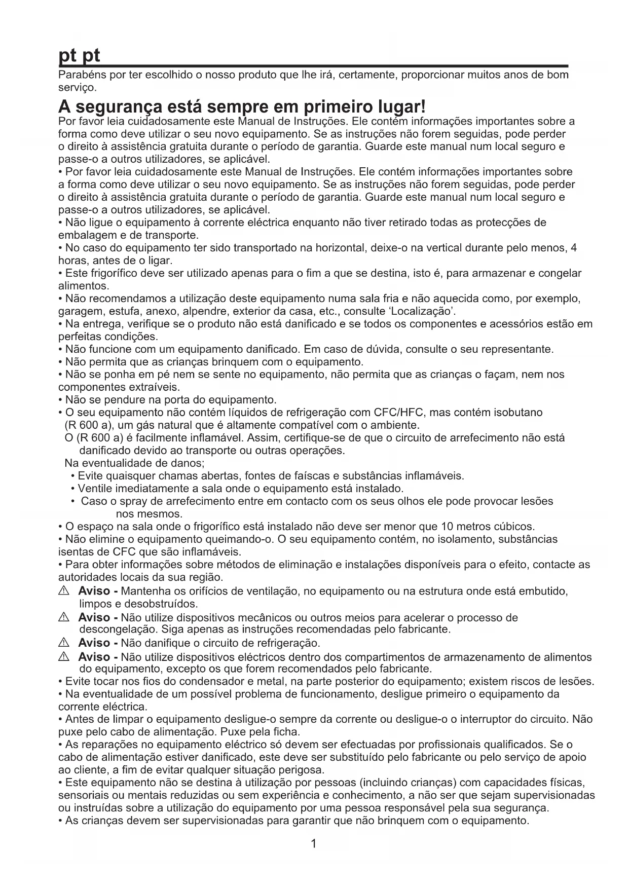 - Para obter informações sobre métodos de eliminação e instalações disponíveis para o efeito, contacte as autoridades locais da sua região. A Aviso - Mantenha os orifícios de ventilação, no equipamento ou na estrutura onde está embutido, limpos e desobstruídos. A Aviso - Não utilize dispositivos mecânicos ou outros meios para acelerar o processo de descongelação. Siga apenas as instruções recomendadas pelo fabricante. A Aviso - Não danifique o circuito de refrigeração. A Aviso - Não utilize dispositivos eléctricos dentro dos compartimentos de armazenamento de alimentos do equipamento, excepto os que forem recomendados pelo fabricante.