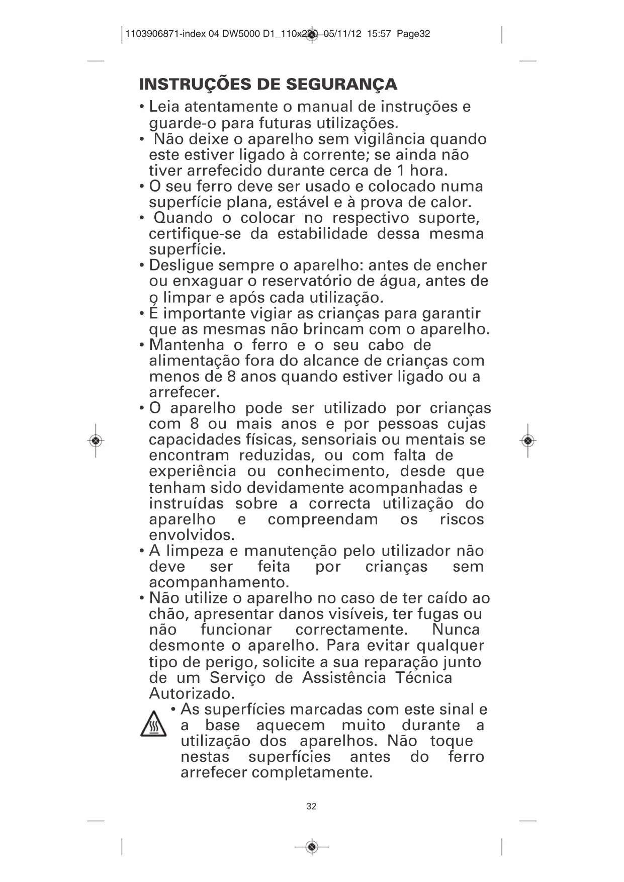 - As superfícies marcadas com este sinal e a base aquecem muito durante a utilização dos aparelhos. Não toque nestas superfícies antes do ferro arrefecer completamente. 1103906871-index 04 DW5000 D1_110x220 05/11/12 15:57 Page3233