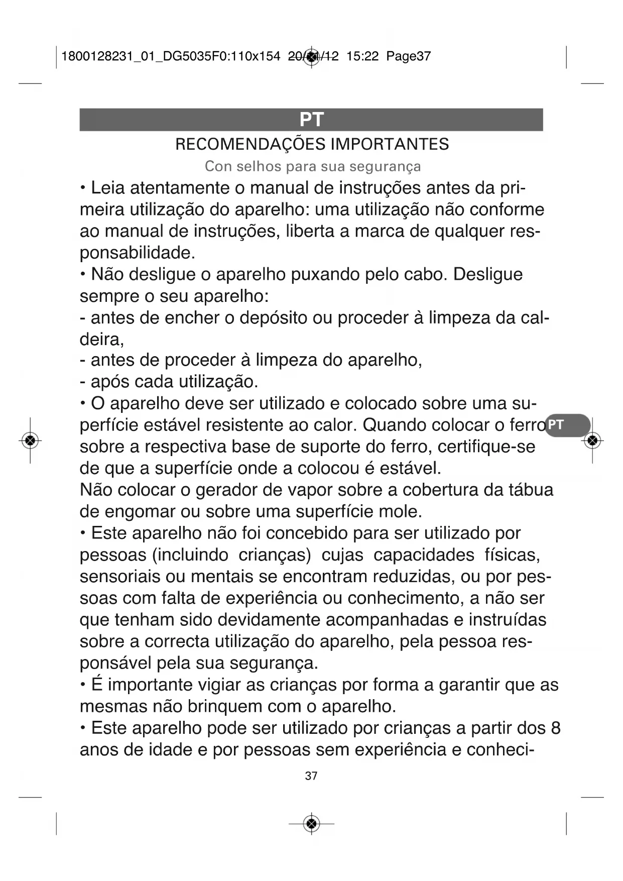 1800128231_01_DG5035F0:110x154 20/11/12 15:22 Page36RECOMENDAÇÕES IMPORTANTES Con selhos para sua segurança