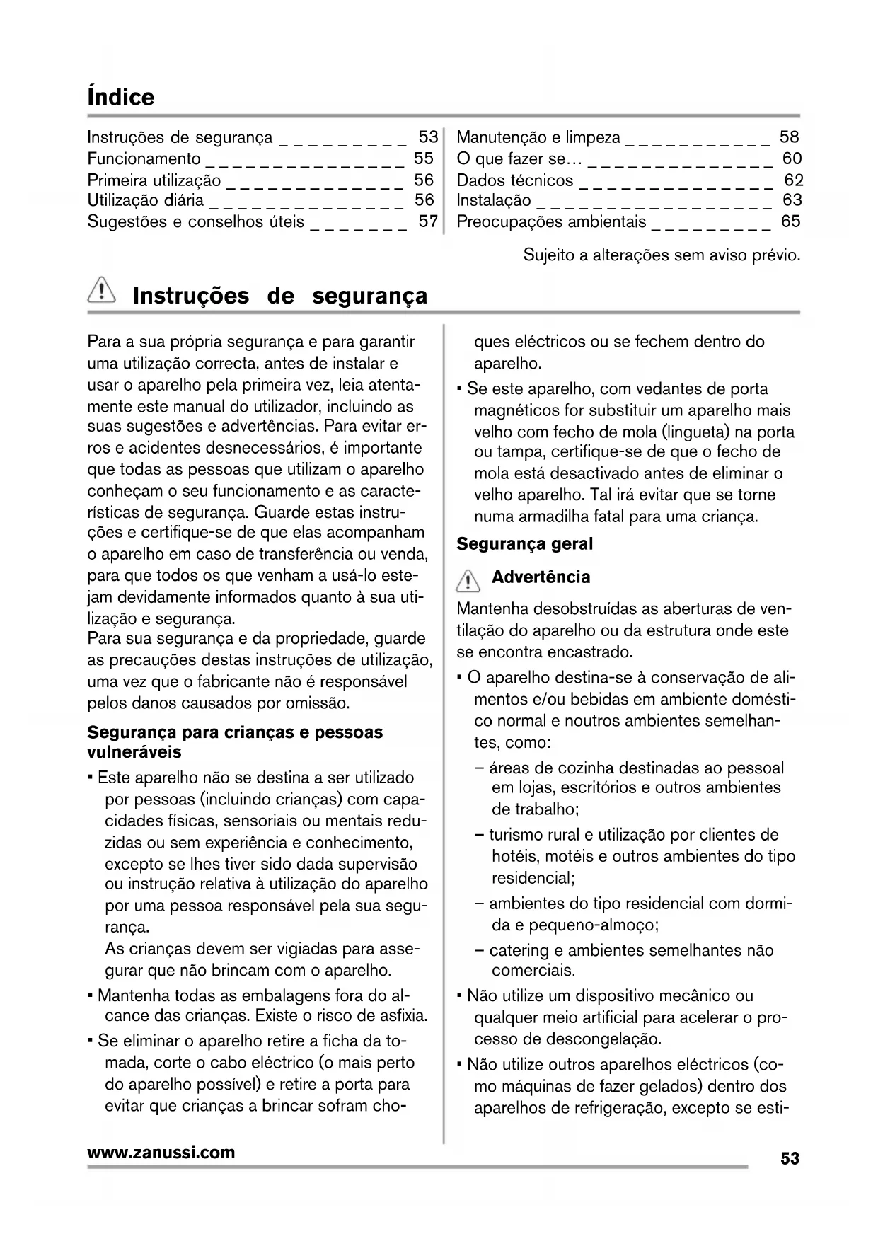 Instruções de segurança _ _ _ _ _ _ _ _ _ 53