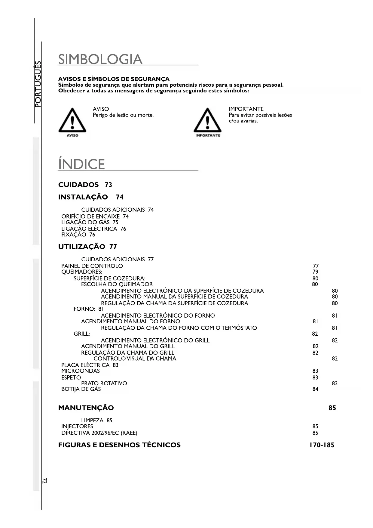 De acordo com o tipo de gás utilizado, o aspecto da chama é o seguinte: Propano (G31): o interior da chama é azul e o contorno nítido. Butano (G30): chama com ligeiras pontas amarelas no acendimento do queimador e que se intensificam lentamente quando o este aquece. Para obter as instruções sobre a instalação, utilização e manutenção do microondas, deve-se consultar o manual de uso que acompanha o microondas. Acender o queimador do forno como indicado no capítulo FORNO. Posicionar o manípulo de comando na posição desejada. Introduzir a pingadeira com o espeto montado, como indicado na FIG. 5 - PÁG. 183. Premir o respectivo interruptor para fazer funcionar o motor do espeto. MICROONDAS ESPETO PLACA ELÉCTRICA (de acordo com o modelo) NO PRIMEIRO ACENDIMENTO DA PLACA ELÉCTRICA (OU SE PERMANECER INUTILIZADA DURANTE MUITO TEMPO), É NECESSÁRIO ELIMINAR A HUMIDADE ABSORVIDA ACENDENDO A PLACA DURANTE 30 MINUTOS NA POSIÇÃO 1 DO MANÍPULO. UTILIZAR PANELAS COM FUNDO PLANO E COM DIÂMETRO NÃO INFERIOR AO