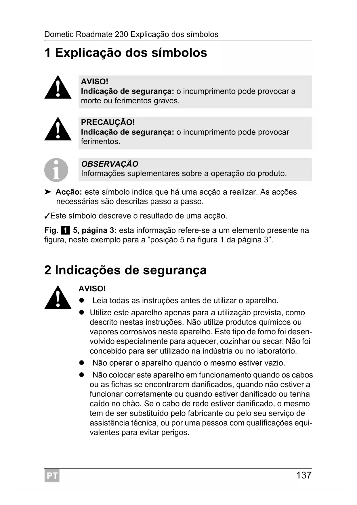 OBSERVAÇÃO Informações suplementares sobre a operação do produto.PT Indicações de segurança Dometic Roadmate 230