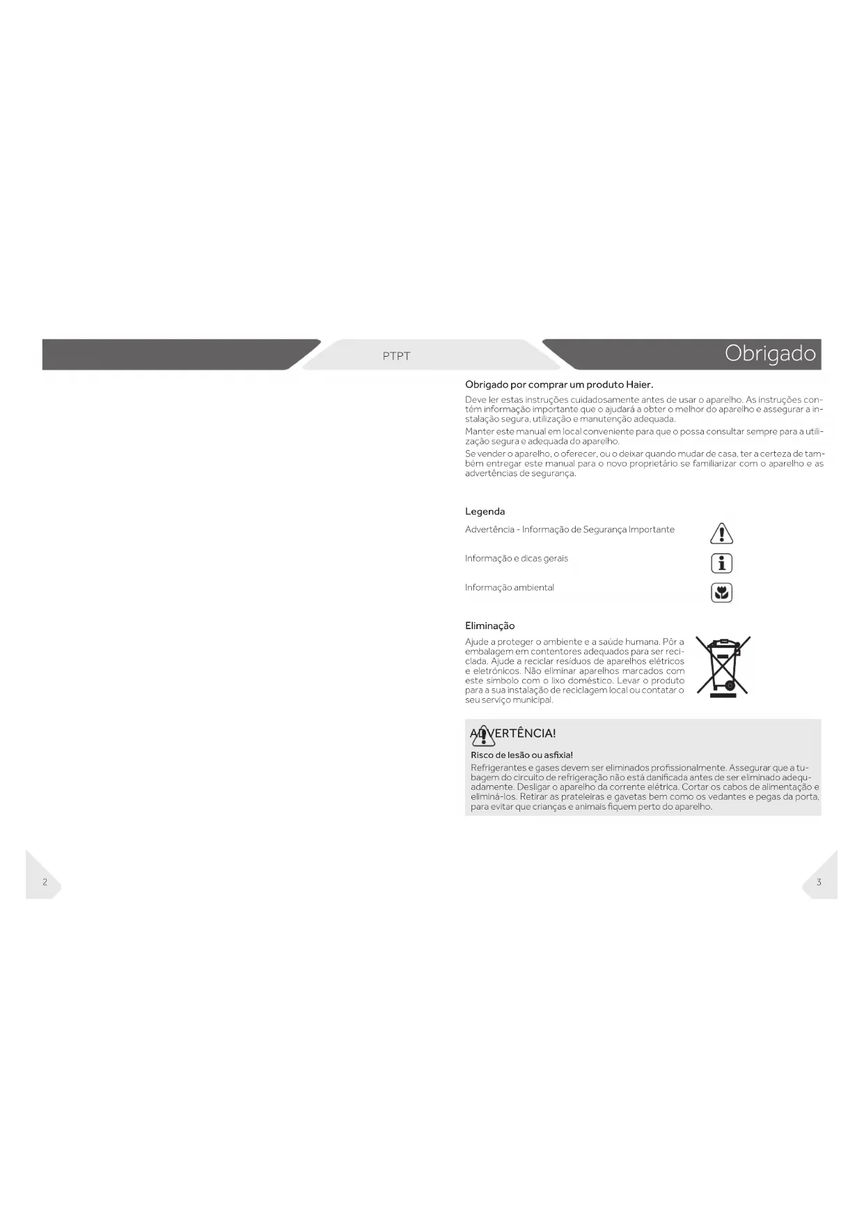 Manual do Utilizador Frigoríco-Congelador HRF-521D*6 *= Código de cor: S,T,CR,BB,W,N,GW, G,B,GR,X,F ou MPT PT Obrigado Legenda Advertência - Informação de Segurança Importante Informação e dicas gerais Informação ambiental Eliminação Ajude a proteger o ambiente e a saúde humana. Pôr a embalagem em contentores adequados para ser reci- clada. Ajude a reciclar resíduos de aparelhos elétricos e eletrónicos. Não eliminar aparelhos marcados com este símbolo com o lixo doméstico. Levar o produto para a sua instalação de reciclagem local ou contatar o seu serviço municipal. Obrigado por comprar um produto Haier. Deve ler estas instruções cuidadosamente antes de usar o aparelho. As instruções con- tém informação importante que o ajudará a obter o melhor do aparelho e assegurar a in- stalação segura, utilização e manutenção adequada. Manter este manual em local conveniente para que o possa consultar sempre para a utili- zação segura e adequada do aparelho. Se vender o aparelho, o oferecer, ou o deixar quando mudar de casa, ter a certeza de tam- bém entregar este manual para o novo proprietário se familiarizar com o aparelho e as advertências de segurança. ADVERTÊNCIA! Risco de lesão ou asxia! Refrigerantes e gases devem ser eliminados prossionalmente. Assegurar que a tu- bagem do circuito de refrigeração não está danicada antes de ser eliminado adequ- adamente. Desligar o aparelho da corrente elétrica. Cortar os cabos de alimentação e eliminá-los. Retirar as prateleiras e gavetas bem como os vedantes e pegas da porta, para evitar que crianças e animais quem perto do aparelho.