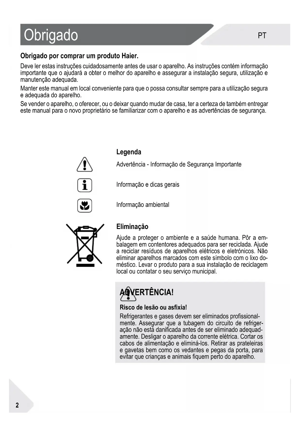 Recomendamos o nosso Serviço ao Cliente Haier e a utilização de peças de substituição originais.