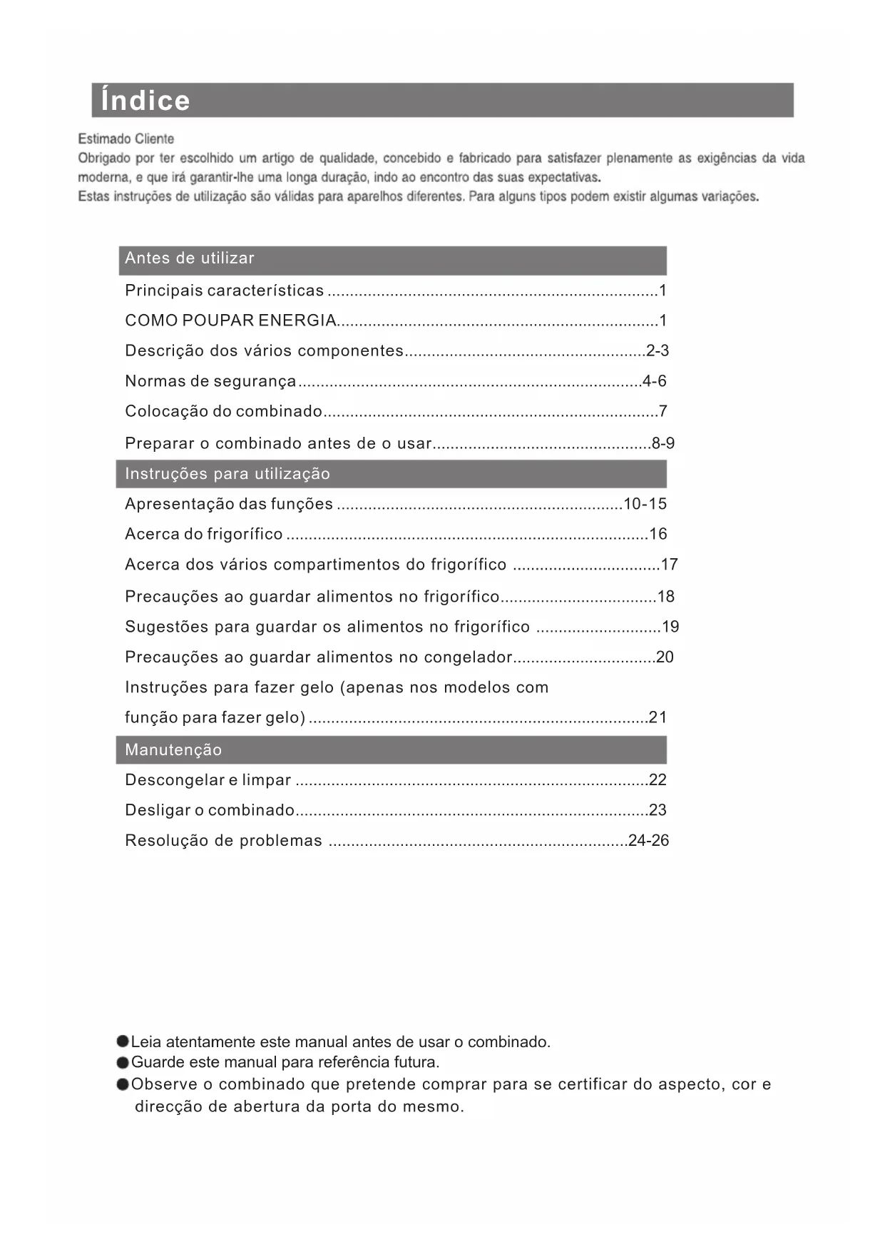 desagradável Houve contaminação de odorcom origem no frigorífico/congelador.A água fornecida ao fazedor degelo não é água corrente.Os cubos de gelo estãoguardados há muito tempo. 25 Sele bem todos os alimentos. Deite fora os cubos degelo que estão guardados há muito tempo ou os primeiroscubos que fez.Adicione um filtro ao tubo da água. Consulte umaempresa de purificação de água.Deite fora os cubos de gelo que estejam guardados hámuito tempo. Maus cheiros no combinado