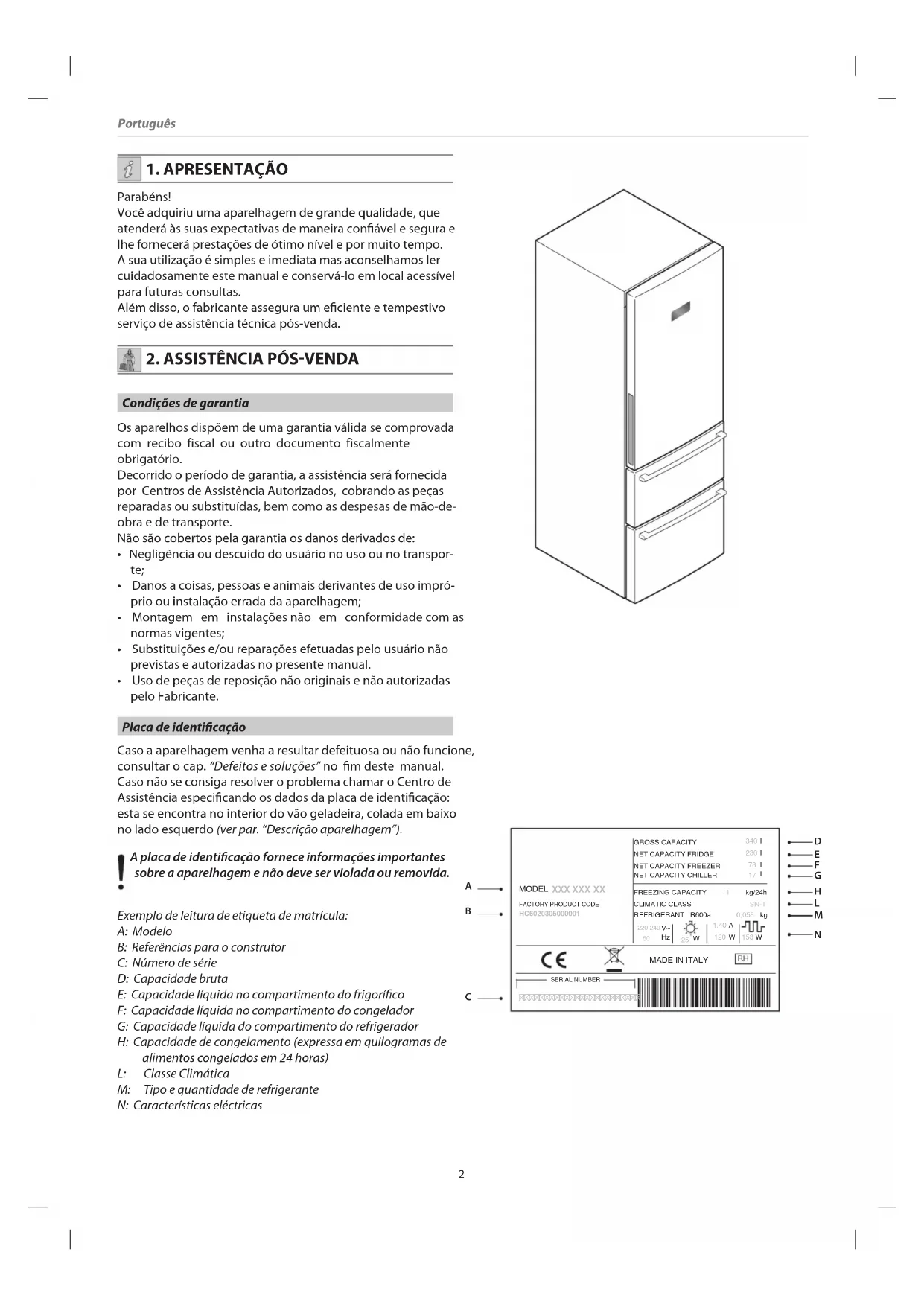 7. MANUTENÇÃO ORDINÁRIA Limpeza da aparelhagem Antes da intervenção desligar a alimentação elétrica.Limpeza internaLimpar todas as partes internas com água morna e sabão neutro, vinagre ou bicarbonato de sódio, em seguida secar cuidadosamente. Em alternativa utilizar detergentes específicos para geladeiras a venda em qualquer supermercado. Não usar detergentese/oupósabrasivos,abasedesoda,ousolventes que possam danicar os acabamentos.Para facilitar a limpeza é possível remover os acessórios internos (consultar o par. “Desmontagem dos componentes”).Limpeza externaLimpar todas as partes externas com detergentes especícos, não usardetergentese/oupósabrasivos,abasedesoda,solventesque possam danicar os acabamentos ou jatos de água.Desmontagem dos componentesPara facilitar as operações de limpeza é possível desmontar todos os componentes internos da aparelhagem.Seguirasindicaçõesdaguraespecíca.A: Gavetas freezer, gaveta fruta/verdura e gaveta “Fresh Control 0°C”: estas gavetas correm sobre guias especiais dotadas de travas, as quais impedem que, ao abrir as gavetas, estas saiam totalmente correndo o risco de cair no chão. Caso se deseje tirá-las da aparelhagem para as operações de limpeza, extraí-las num comprimento equivalente a 3/4 de sua profundidade, erguê-las ligeiramente e prosseguir com a extração continuando a mantê-las inclinadas para cima.B: Compartimentos da porta: estão simplesmente introduzidos nas guias integradas na porta, para extraí-los levantá-los empurrando-os rmemente por baixo.C: Gavetas freezer: por motivos de segurança não é possível extraí-las completamente da aparelhagem; uma vez abertas até a máxima extração permitida å é possível extrair as gavetas internas simplesmente erguendo-as ç.D: Prateleira de vidro em duas partes: a prateleira dianteira (D2) está enganchada naquela traseira para impedir sua saída acidental (ver det.ç); para extraí-la erguer ligeiramente a prateleira traseira (D1) e puxar a prateleira dianteira (D2). A prateleira traseira (D1) tem sua extremidade bloqueada por dois pinos que impedem a sua saída acidental (ver det.é), para extraí-la erguê-la e puxá-la até que saia. Quando as duas prateleiras (D1 e D2) são reposicionadas certicar-se que se enganchem novamente uma na outra.E: Prateleira de vidro com porta garrafas: a prateleira corre sobre guias e tem dois pinos que impedem a sua saída acidental (ver det.å); caso se deseje retirá-la da aparelhagem para as operações de limpeza, erguê-la ligeiramente e extraí-la continuando a mantê-la inclinada para cima. F: Prateleira de vidro: a prateleira corre sobre guias, caso se deseje retirá-la da aparelhagem para as operações de limpeza tirar a gaveta “Fresh Control 0°C”, erguer ligeiramente a prateleira e extraí-la continuando a mantê-la inclinada para cima.
