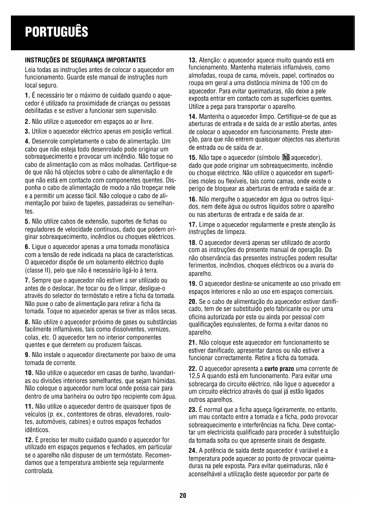 21. Não coloque este aquecedor em funcionamento se