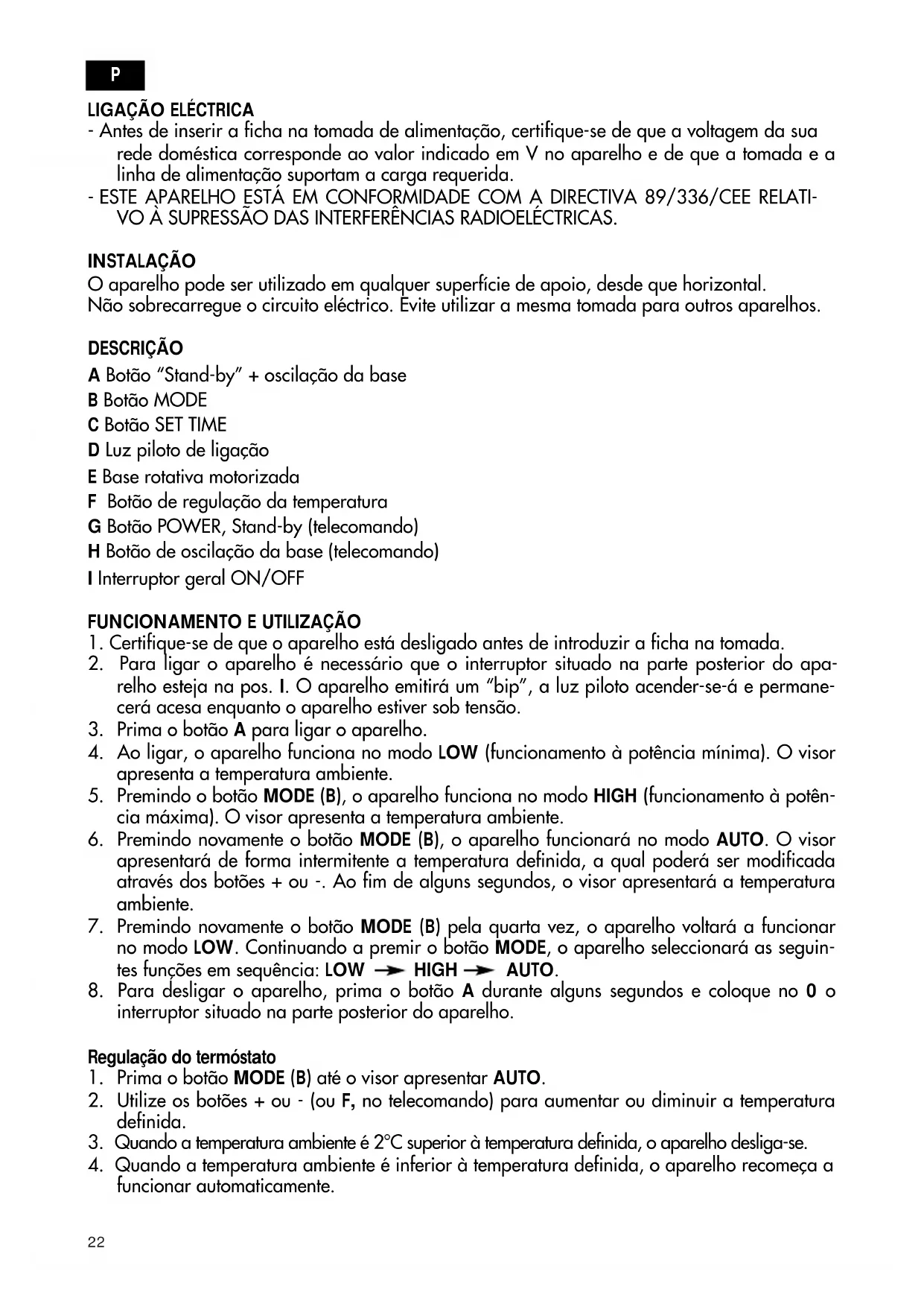 Para utilizes as funções de OSCILACAO (botão H), SET TIME (botão C), MODE (botão B) e para a regulação da temperatura (botão F), consulta a�� FUNCIONAMENTO E UTILIZACAO.