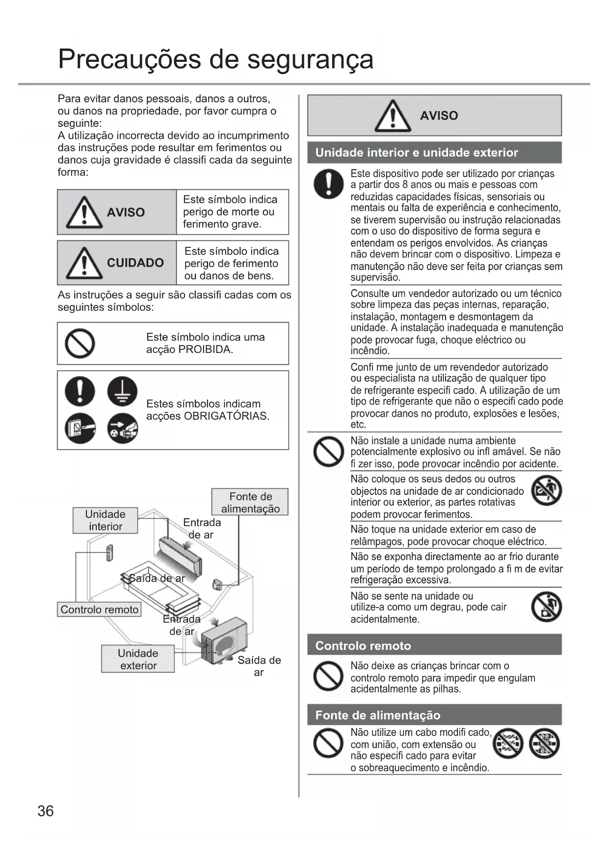 - 2 parafusos do suporte do controlo remoto36 Precauções de segurança Para evitar danos pessoais, danos a outros, ou danos na propriedade, por favor cumpra o seguinte: A utilização incorrecta devido ao incumprimento das instruções pode resultar em ferimentos ou danos cuja gravidade é classifi cada da seguinte forma: AVISO Este símbolo indica perigo de morte ou ferimento grave. CUIDADO Este símbolo indica perigo de ferimento ou danos de bens. As instruções a seguir são classifi cadas com os seguintes símbolos: Este símbolo indica uma acção PROIBIDA. Estes símbolos indicam acções OBRIGATÓRIAS. AVISO Unidade interior e unidade exterior Este dispositivo pode ser utilizado por crianças a partir dos 8 anos ou mais e pessoas com reduzidas capacidades físicas, sensoriais ou mentais ou falta de experiência e conhecimento, se tiverem supervisão ou instrução relacionadas com o uso do dispositivo de forma segura e entendam os perigos envolvidos. As crianças não devem brincar com o dispositivo. Limpeza e manutenção não deve ser feita por crianças sem supervisão. Consulte um vendedor autorizado ou um técnico sobre limpeza das peças internas, reparação, instalação, montagem e desmontagem da unidade. A instalação inadequada e manutenção pode provocar fuga, choque eléctrico ou incêndio. Confi rme junto de um revendedor autorizado ou especialista na utilização de qualquer tipo de refrigerante especifi cado. A utilização de um tipo de refrigerante que não o especifi cado pode provocar danos no produto, explosões e lesões, etc. Não instale a unidade numa ambiente potencialmente explosivo ou infl amável. Se não fi zer isso, pode provocar incêndio por acidente. Não coloque os seus dedos ou outros objectos na unidade de ar condicionado interior ou exterior, as partes rotativas podem provocar ferimentos. Não toque na unidade exterior em caso de relâmpagos, pode provocar choque eléctrico. Não se exponha directamente ao ar frio durante um período de tempo prolongado a fi m de evitar refrigeração excessiva. Não se sente na unidade ou utilize-a como um degrau, pode cair acidentalmente. Controlo remoto Não deixe as crianças brincar com o controlo remoto para impedir que engulam acidentalmente as pilhas. Fonte de alimentação Não utilize um cabo modifi cado, com união, com extensão ou não especifi cado para evitar o sobreaquecimento e incêndio. Unidade interior Unidade exterior Fonte de alimentação Controlo remoto Entrada Entrada de ar de ar Entrada Entrada de ar de ar Saída de ar Saída de ar Saída de Saída de