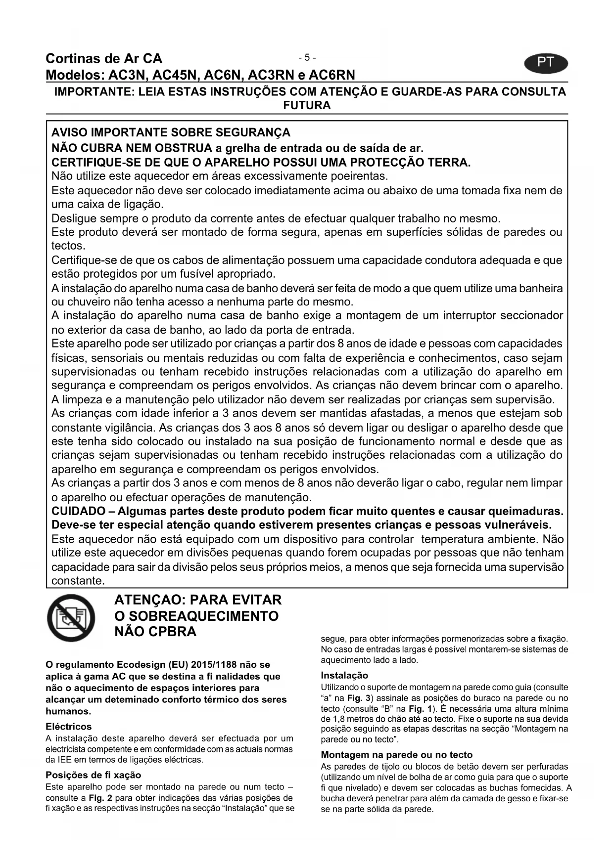 NÃO CUBRA NEM OBSTRUA a grelha de entrada ou de saída de ar. CERTIFIQUE-SE DE QUE O APARELHO POSSUI UMA PROTECÇÃO TERRA. Não utilize este aquecedor em áreas excessivamente poeirentas. Este aquecedor não deve ser colocado imediatamente acima ou abaixo de uma tomada fi xa nem de uma caixa de ligação. Desligue sempre o produto da corrente antes de efectuar qualquer trabalho no mesmo. Este produto deverá ser montado de forma segura, apenas em superfícies sólidas de paredes ou tectos. Certifi que-se de que os cabos de alimentação possuem uma capacidade condutora adequada e que estão protegidos por um fusível apropriado. A instalação do aparelho numa casa de banho deverá ser feita de modo a que quem utilize uma banheira ou chuveiro não tenha acesso a nenhuma parte do mesmo. A instalação do aparelho numa casa de banho exige a montagem de um interruptor seccionador no exterior da casa de banho, ao lado da porta de entrada. Este aparelho pode ser utilizado por crianças a partir dos 8 anos de idade e pessoas com capacidades físicas, sensoriais ou mentais reduzidas ou com falta de experiência e conhecimentos, caso sejam supervisionadas ou tenham recebido instruções relacionadas com a utilização do aparelho em segurança e compreendam os perigos envolvidos. As crianças não devem brincar com o aparelho. A limpeza e a manutenção pelo utilizador não devem ser realizadas por crianças sem supervisão. As crianças com idade inferior a 3 anos devem ser mantidas afastadas, a menos que estejam sob constante vigilância. As crianças dos 3 aos 8 anos só devem ligar ou desligar o aparelho desde que este tenha sido colocado ou instalado na sua posição de funcionamento normal e desde que as crianças sejam supervisionadas ou tenham recebido instruções relacionadas com a utilização do aparelho em segurança e compreendam os perigos envolvidos. As crianças a partir dos 3 anos e com menos de 8 anos não deverão ligar o cabo, regular nem limpar o aparelho ou efectuar operações de manutenção. CUIDADO – Algumas partes deste produto podem fi car muito quentes e causar queimaduras. Deve-se ter especial atenção quando estiverem presentes crianças e pessoas vulneráveis. Este aquecedor não está equipado com um dispositivo para controlar temperatura ambiente. Não utilize este aquecedor em divisões pequenas quando forem ocupadas por pessoas que não tenham capacidade para sair da divisão pelos seus próprios meios, a menos que seja fornecida uma supervisão constante. O regulamento Ecodesign (EU) 2015/1188 não se aplica à gama AC que se destina a fi nalidades que não o aquecimento de espaços interiores para alcançar um deteminado conforto térmico dos seres humanos. Eléctricos A instalação deste aparelho deverá ser efectuada por um electricista competente e em conformidade com as actuais normas da IEE em termos de ligações eléctricas. Posições de fi xação Este aparelho pode ser montado na parede ou num tecto – consulte a Fig. 2 para obter indicações das várias posições de fi xação e as respectivas instruções na secção “Instalação” que se segue, para obter informações pormenorizadas sobre a fi xação. No caso de entradas largas é possível montarem-se sistemas de aquecimento lado a lado. Instalação Utilizando o suporte de montagem na parede como guia (consulte “a” na Fig. 3) assinale as posições do buraco na parede ou no tecto (consulte “B” na Fig. 1). É necessária uma altura mínima de 1,8 metros do chão até ao tecto. Fixe o suporte na sua devida posição seguindo as etapas descritas na secção “Montagem na parede ou no tecto”. Montagem na parede ou no tecto As paredes de tijolo ou blocos de betão devem ser perfuradas (utilizando um nível de bolha de ar como guia para que o suporte fi que nivelado) e devem ser colocadas as buchas fornecidas. A bucha deverá penetrar para além da camada de gesso e fi xar-se se na parte sólida da parede.