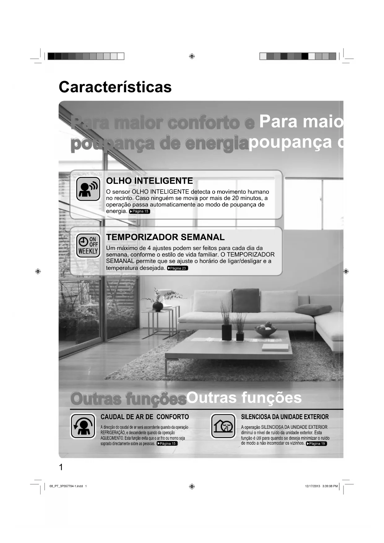 o Operação em modo AUTOMÁTICO · SECAGEM · REFRIGERAÇÃO · AQUECIMENTO · VENTILADOR 11Ajuste da direcção e da razão do caudal de ar 13Operação CAUDAL DE AR DE CONFORTO/OLHO INTELLIGENTE 15Operação POTENTE 18Operação ECONO/SILENCIOSA DA UNIDADE EXTERIOR 19Operação DESLIGAR COM TEMPORIZADOR 21Operação LIGAR COM TEMPORIZADOR 22Operação do TEMPORIZADOR SEMANAL 23 Conexão múltipl