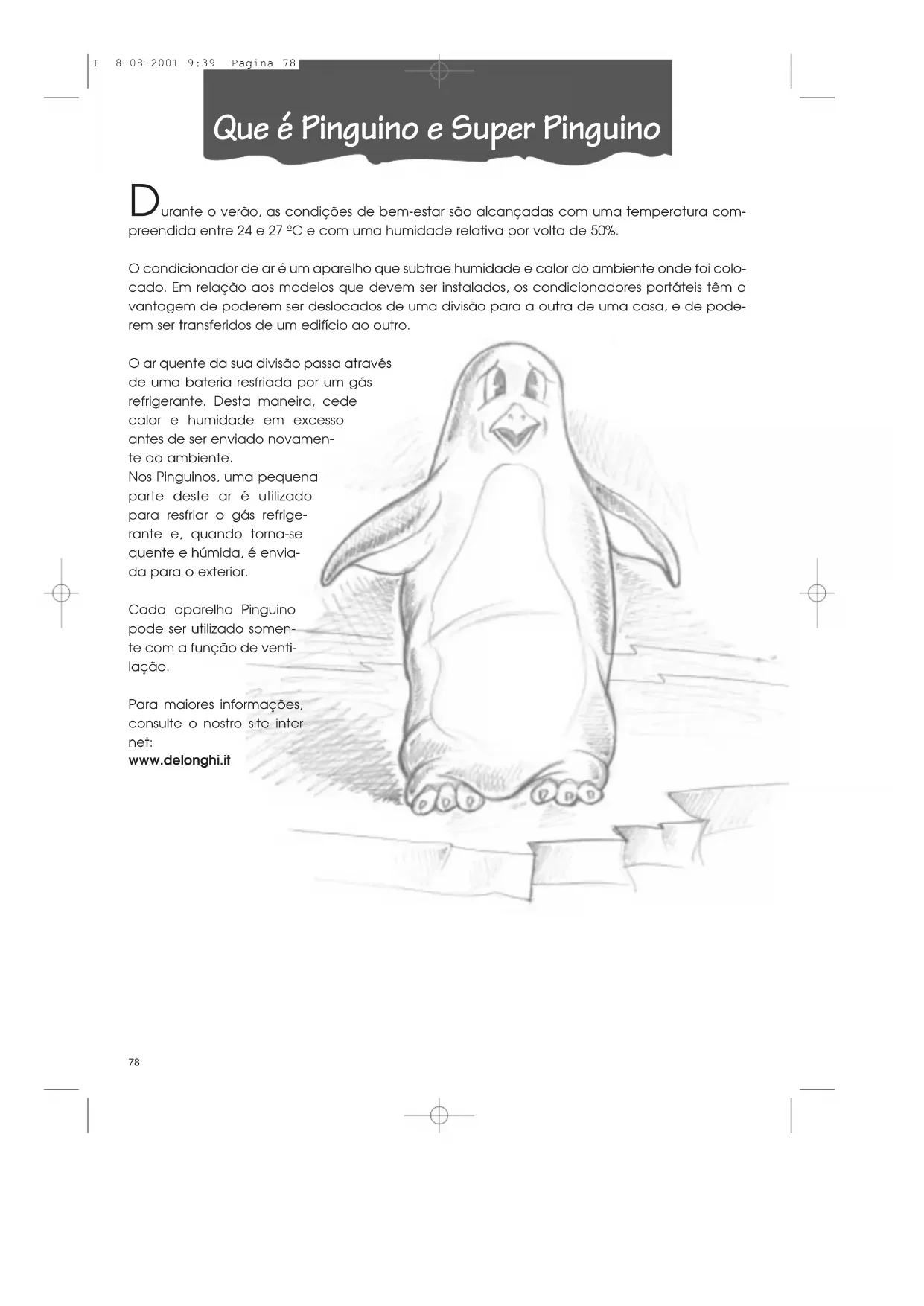 agradecemos por ter escolhido um produto Dé Longhi, o líder mundial na fabricação dos condicionadores portáteis. Anos de experiência em todo o mundo permitem-nos melhorar constantemente a qualidade e os desempenhos dos aparelhos Pinguino. Temos certeza de que ficará logo satisfeito com a sua compra e que usufruirá por muito tempo do fresco bem-estar que Pinguino e Super Pinguino oferecem. Por favor, dedique um pouco do seu tempo à leitura deste manual de instruções e conserve-o com cuidado. Desta forma, poderá utilizar o aparelho Pinguino com a máxima eficácia e serenidade.