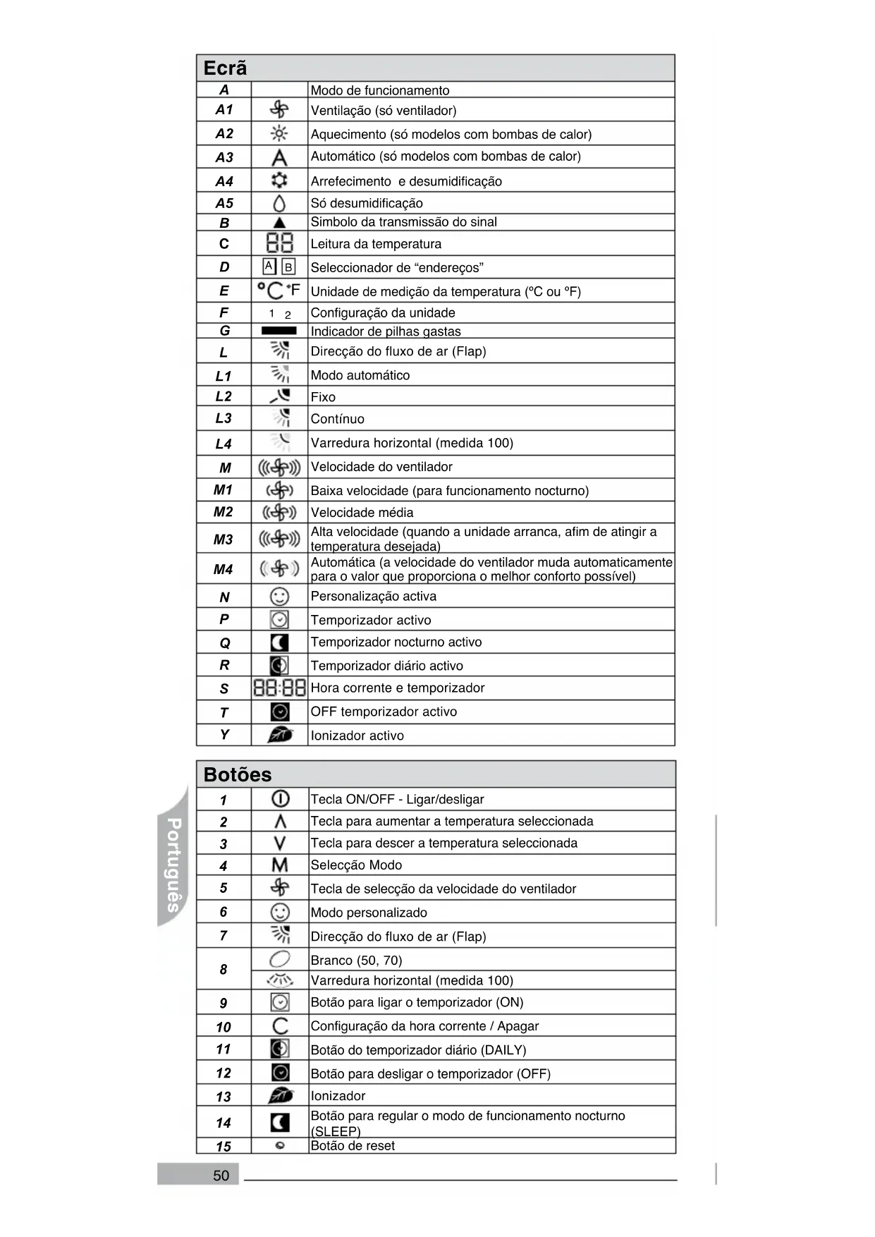 Contínuo Varredura horizontal (medida 100) Velocidade do ventilador Baixa velocidade (para funcionamento nocturno) Velocidade média Alta velocidade (quando a unidade arranca, am de atingir a temperatura desejada) Automática (a velocidade do ventilador muda automaticamente para o valor que proporciona o melhor conforto possível) Personalização activa Temporizador activo Temporizador nocturno activo Temporizador diário activo Hora corrente e temporizador OFF temporizador activo Ionizador activo Botões