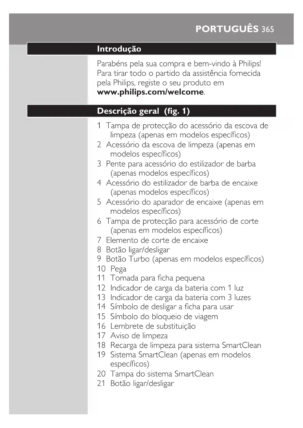PORTUGUÊS 387- Cada anel de retenção possui duas reentrâncias e duas saliências que encaixam com exactidão nas saliências e nas reentrâncias do suporte da cabeça de corte. - Rode o anel para a direita até ouvir um estalido e o anel estar xo. Nota: Segure o suporte da cabeça de corte na sua mão quando voltar a inserir as cabeças de corte e voltar a xar os anéis de retenção. Não pouse o suporte da cabeça de corte sobre nenhuma superfície ao fazer isto, pois pode causar danos. 9 Volte a colocar a articulação do suporte da cabeça de corte na ranhura do acessório de corte. Feche o suporte da cabeça de corte (ouve-se um estalido). Limpar os acessórios de encaixe Nunca seque o aparador nem os acessórios do estilizador de barba com uma toalha ou com papel, pois isto pode danicar os dentes aparadores. Limpar o acessório aparador Limpe o acessório aparador sempre que o utilizar. 1 Ligue o aparelho com o acessório aparador encaixado. PORTUGUÊS3882 Enxagúe o acessório aparador em água quente corrente durante algum tempo. 3 Depois da limpeza, desligue o aparelho. 4 Sacuda cuidadosamente o excesso de água e deixe o acessório aparador secar. Sugestão: A cada seis meses, lubrique os dentes do aparador com uma gota de óleo para máquinas de costura para obter o melhor desempenho. Limpar o acessório estilizador de barba Limpe o acessório estilizador de barba de cada vez que o utilizar. 1 Retire o pente do acessório estilizador de barba, puxando-o. Nota: Agarre o pente pelo centro e puxe-o para fora do acessório. Não puxe o pente pelos lados. 2 Ligue o aparelho. 3 Enxagúe o acessório estilizador de barba e o pente, em separado, em água quente corrente durante algum tempo. 4 Depois da limpeza, desligue o aparelho. 5 Sacuda cuidadosamente o excesso de água e deixe o acessório estilizador de barba e o pente secarem. Sugestão: A cada seis meses, lubrique os dentes do aparador com uma gota de óleo para máquinas de costura para obter o melhor desempenho. PORTUGUÊS 389Limpar o acessório da escova de limpeza Limpe o acessório da escova de limpeza de cada vez que o utilizar. 1 Certique-se de que o aparelho está desligado. 2 Retire a cabeça da escova da sua base. 3 Lave ambas as peças cuidadosamente com água quente e um detergente suave. 4 Seque o acessório da escova de limpeza com uma toalha. Arrumação Nota: Os acessórios fornecidos podem variar consoante os diferentes produtos. A caixa mostra os acessórios que são fornecidos com o seu aparelho. Nota: Aconselhamo-lo a deixar secar o aparelho e os seus acessórios antes de colocar as capas de protecção nos acessórios e de guardar a máquina de barbear na bolsa. - Coloque a tampa de protecção no acessório de corte para o proteger da acumulação de sujidade. PORTUGUÊS390- Guarde a máquina de barbear na bolsa fornecida. - Coloque a tampa de protecção no acessório da escova de limpeza para o proteger da acumulação de sujidade. Substituição Substituir a cabeça da escova de limpeza - O acessório da cabeça da escova de limpeza deve ser substituído a cada 3 meses ou antes se os lamentos forem deformados ou danicados. Substituição das cabeças de corte Para o desempenho máximo de corte, é aconselhável substituir as cabeças de corte a cada dois anos. Lembrete de substituição O símbolo do acessório de corte acende-se para indicar que as cabeças de corte precisam de ser substituídas. Substitua imediatamente cabeças de corte danicadas. Substitua as cabeças de corte apenas por cabeças de corte originais da Philips conforme especicado no capítulo “Encomendar acessórios”. PORTUGUÊS 3911 O símbolo do acessório de corte mantém-se continuamente acesa, quando desliga a máquina de barbear para indicar que as cabeças de corte precisam de ser substituídas. 2 prima o botão de libertação e abra o acessório de corte. 3 Puxe o suporte da cabeça de corte para fora da parte inferior do acessório de corte. 4 Rode os anéis de retenção para a esquerda e retire-os. 5 Retire as cabeças de corte do respectivo suporte e elimine-as.