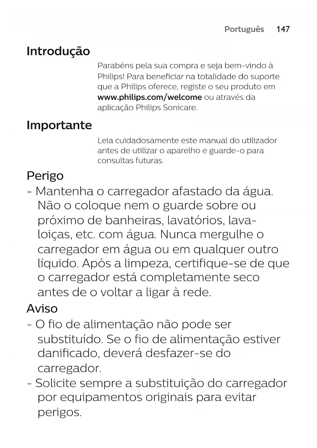 NederlandsPortuguês Introdução Parabéns pela sua compra e seja bem-vindo à Philips! Para beneficiar na totalidade do suporte que a Philips oferece, registe o seu produto em www.philips.com/welcome ou através da aplicação Philips Sonicare. Importante Leia cuidadosamente este manual do utilizador antes de utilizar o aparelho e guarde-o para consultas futuras. Perigo - Mantenha o carregador afastado da água. Não o coloque nem o guarde sobre ou próximo de banheiras, lavatórios, lava- loiças, etc. com água. Nunca mergulhe o carregador em água ou em qualquer outro líquido. Após a limpeza, certifique-se de que o carregador está completamente seco antes de o voltar a ligar à rede. Aviso - O fio de alimentação não pode ser substituído. Se o fio de alimentação estiver danificado, deverá desfazer-se do carregador. - Solicite sempre a substituição do carregador por equipamentos originais para evitar perigos.