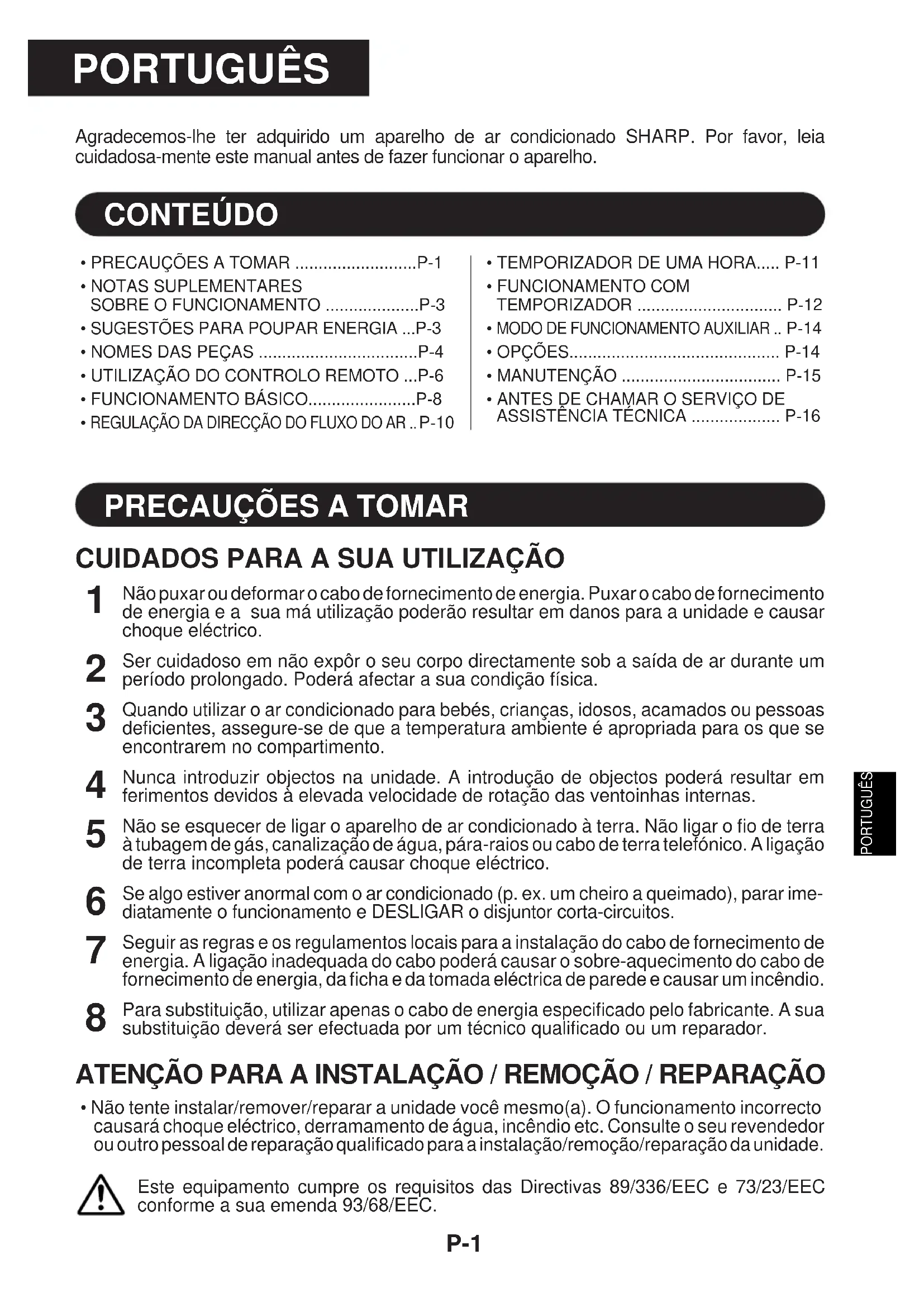 - Nel modo di funzionamento RISCALDAMENTO, del vapore acqueo può fuoriuscire dall’unità esterna durante lo sbrinamento. (Solo per i modelli AY-A07BE/AY- A09BE/AY-A12BE) Richiedete dell'assistenza tecnica quando lampeggiano sul pannello degli indicatori la spia FUNZIONAMENTO (OPERATION) e quella TIMER.PORTUGUÊS P-1 PORTUGUÊS Agradecemos-lhe ter adquirido um aparelho de ar condicionado SHARP. Por favor, leia cuidadosa-mente este manual antes de fazer funcionar o aparelho.• PRECAUÇÕES A TOMAR ..........................P-1• NOTAS SUPLEMENTARESSOBRE O FUNCIONAMENTO ....................P-3• SUGESTÕES PARA POUPAR ENERGIA ...P-3• NOMES DAS PEÇAS ..................................P-4• UTILIZAÇÃO DO CONTROLO REMOTO ...P-6• FUNCIONAMENTO BÁSICO.......................P-8 REGULAÇÃO DA DIRECÇÃO DO FLUXO DO AR .. P-10 CONTEÚDO