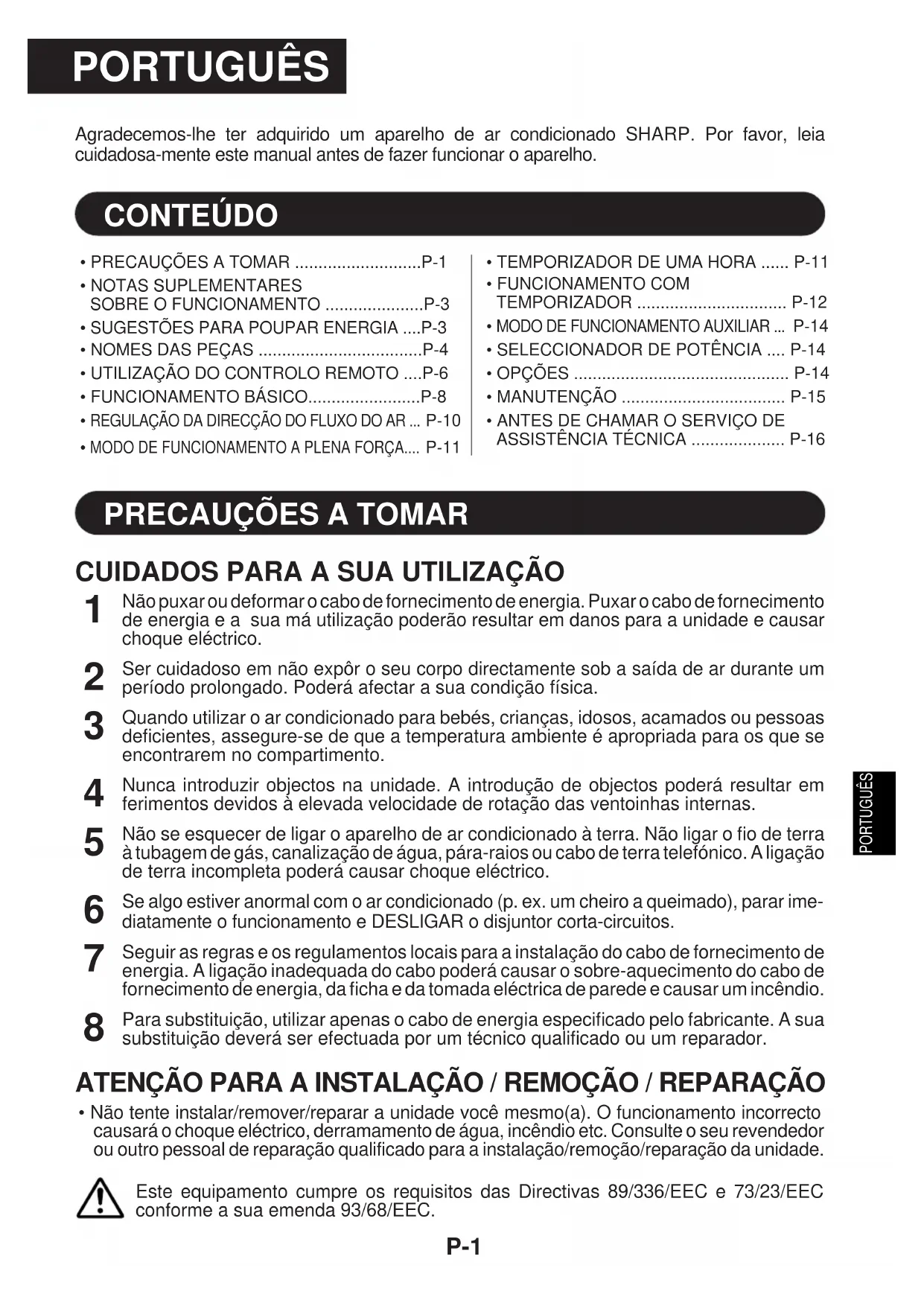 - Não tente instalar/remover/reparar a unidade você mesmo(a). O funcionamento incorrectocausará o choque eléctrico, derramamento de água, incêndio etc. Consulte o seu revendedorou outro pessoal de reparação qualificado para a instalação/remoção/reparação da unidade.Este equipamento cumpre os requisitos das Directivas 89/336/EEC e 73/23/EECconforme a sua emenda 93/68/EEC. CONTEÚDOP-2