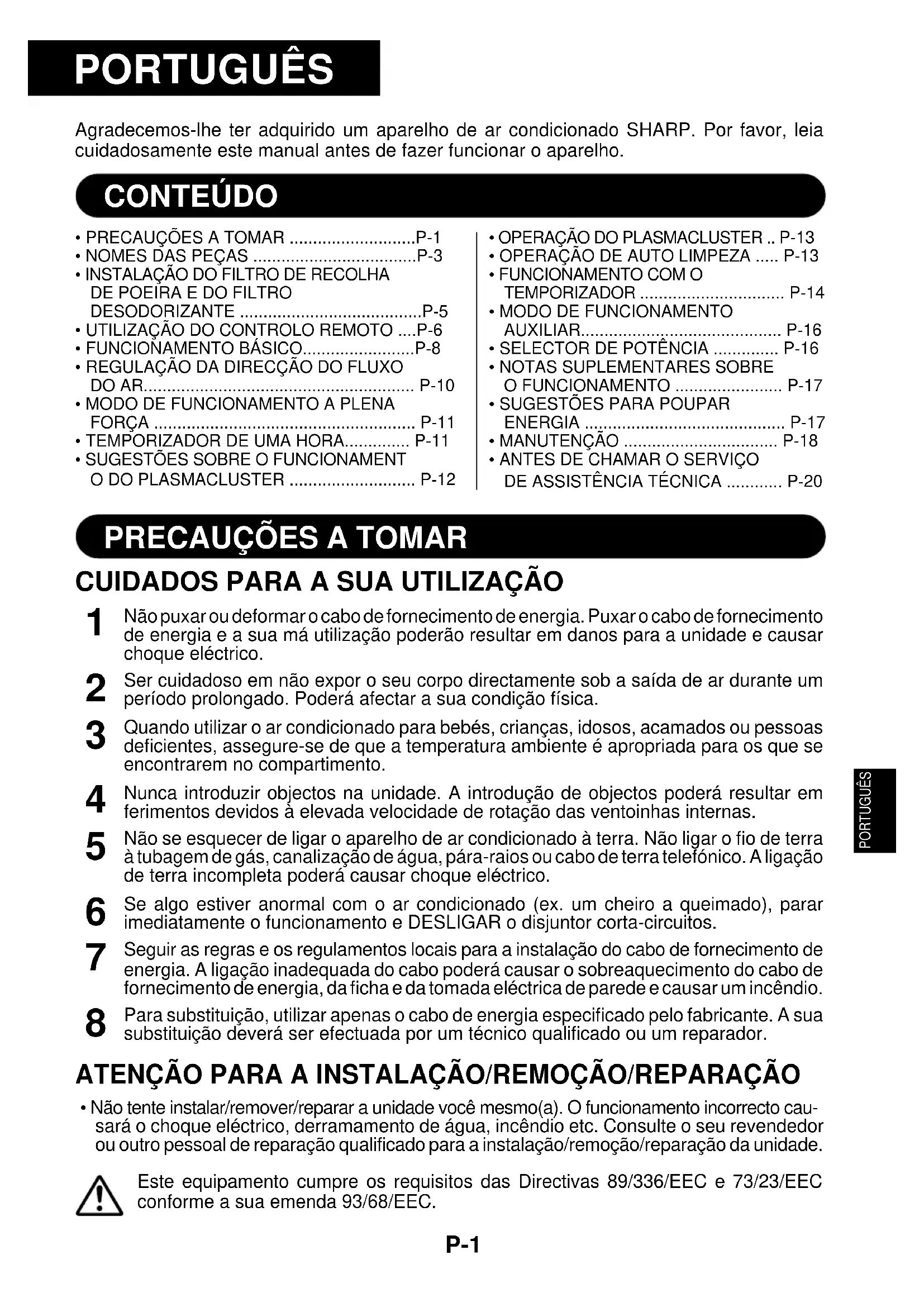 Agradecemos-lhe ter adquirido um aparelho de ar condicionado SHARP. Por favor, leia cuidadosamente este manual antes de fazer funcionar o aparelho.