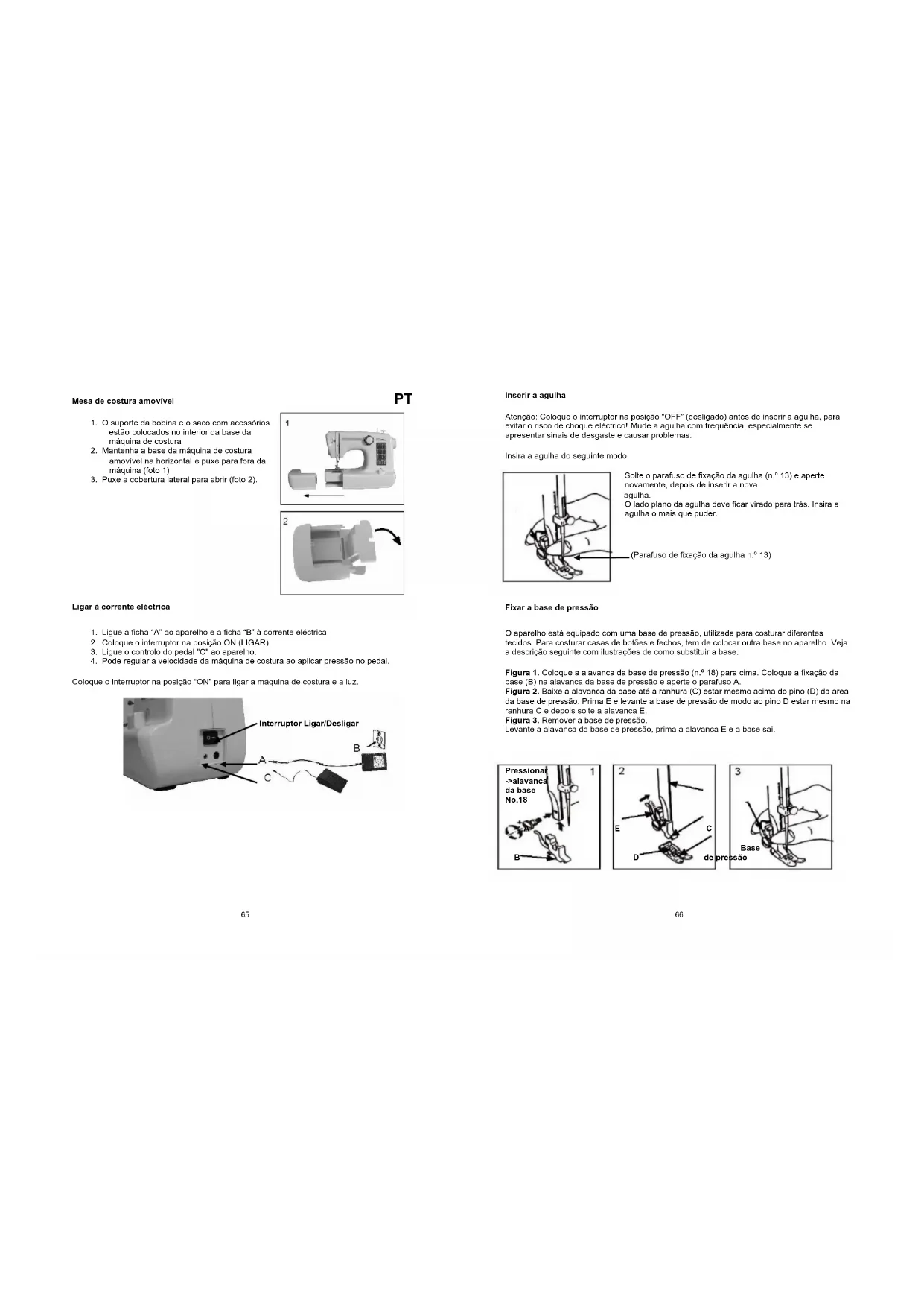 Figura 1. Coloque a alavanca da base de pressão (n.º 18) para cima. Coloque a fixação da base (B) na alavanca da base de pressão e aperte o parafuso A. Figura 2. Baixe a alavanca da base até a ranhura (C) estar mesmo acima do pino (D) da área da base de pressão. Prima E e levante a base de pressão de modo ao pino D estar mesmo na ranhura C e depois solte a alavanca E. Figura 3. Remover a base de pressão. Levante a alavanca da base de pressão, prima a alavanca E e a base sai.