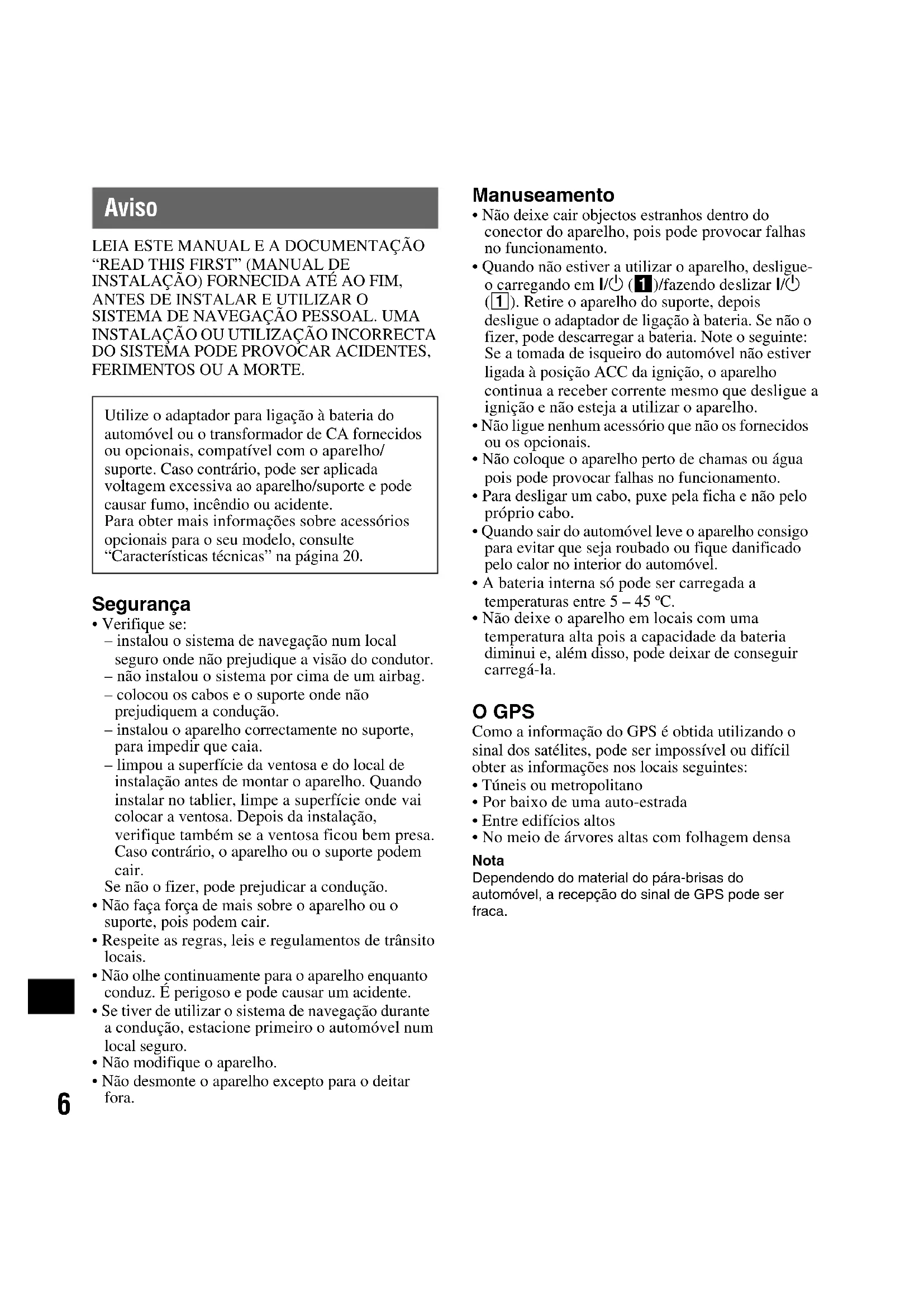 LEIA ESTE MANUAL E A DOCUMENTA O "READ THIS FIRST" (MANUAL DE INSTALA O) FORNECIDA AT E AO FIM, ANTES DE INSTALAR E UTILizar O SISTEMA DE NAVEGACAO PESOAL. UMA INSTALA O O UTILIZATION INCORRECTA DO SISTEMA PODE PROVOCAR ACIDENTES, FERIMENTOS OU A MORTE.