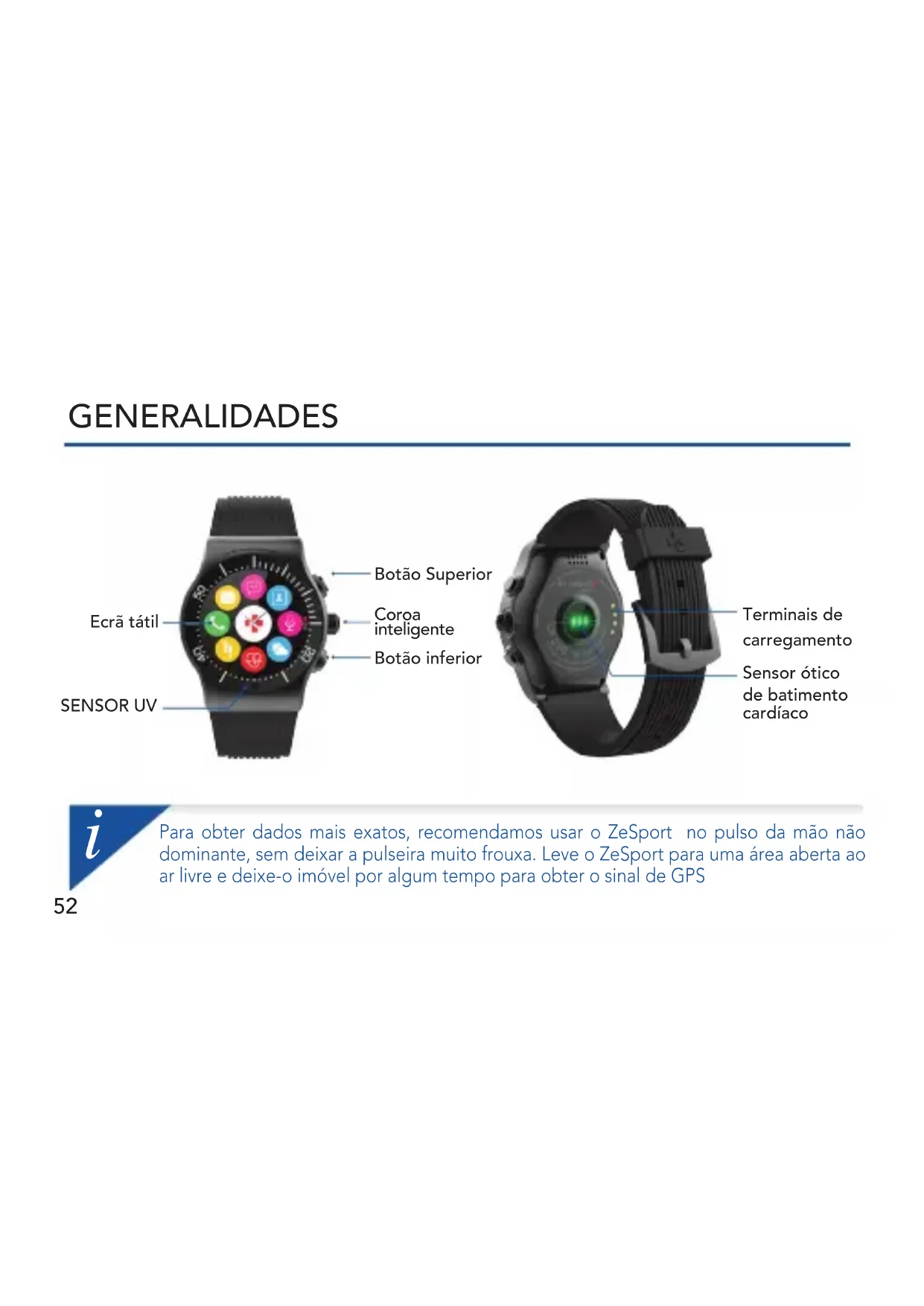Ecrã tátil SENSOR UV Botão Superior Coroa inteligente Botão inferior Sensor ótico de batimento cardíaco Terminais de carregamentoi
