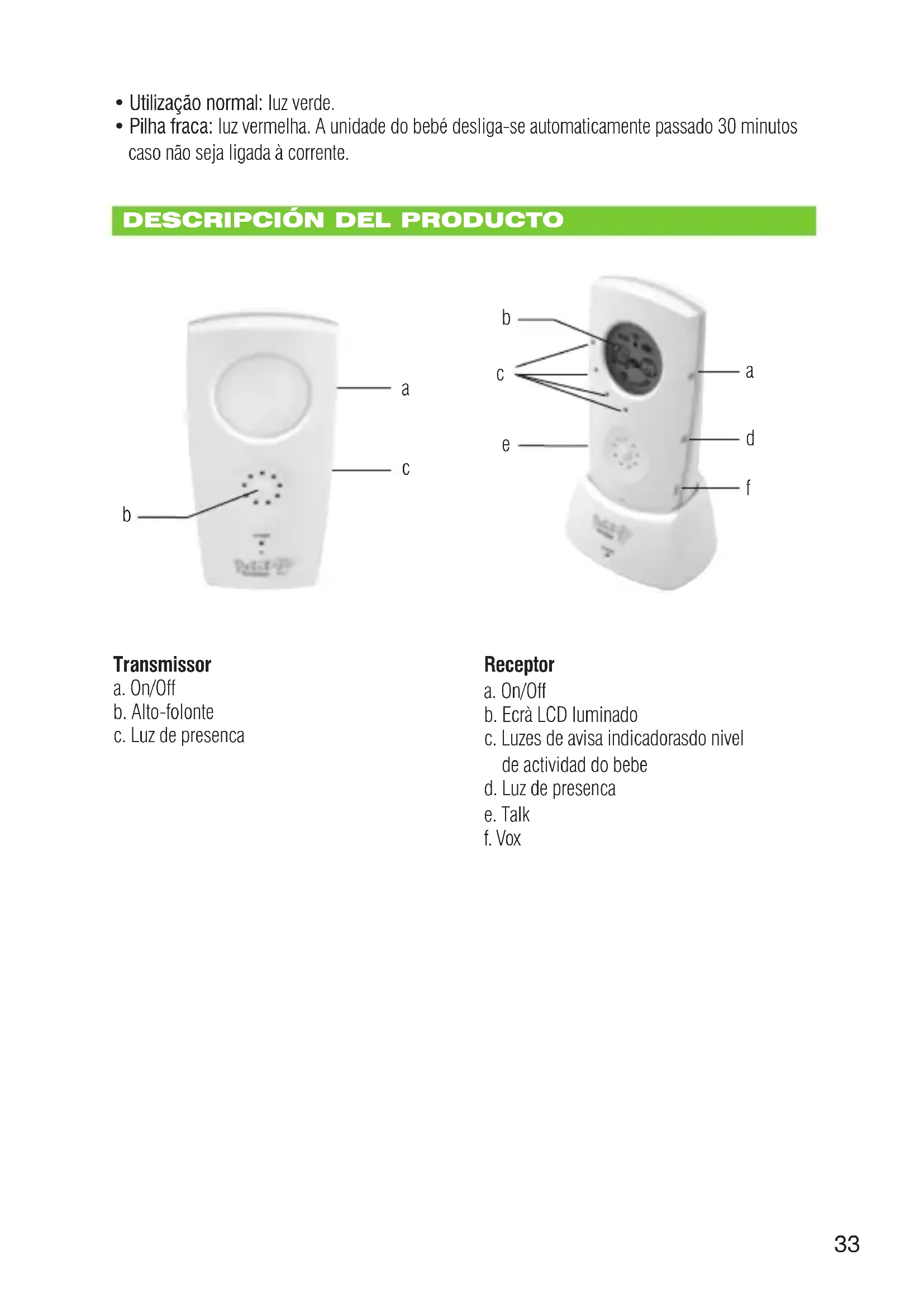 - Sistema vox: os monitores de bebé são obrigados por lei a operar de forma intermitente. Por este motivo, na ausência de actividade, o transmissor comuta automaticamente para o modo de espera, para não consumir a carga das pilhas ou desperdiçar energia desnecessária.