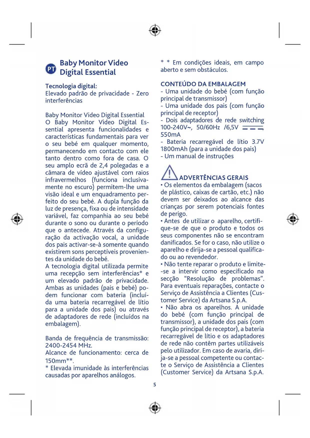 - Não abra os aparelhos. A unidade do bebé (com função principal de transmissor), a unidade dos pais (com função principal de receptor), a bateria recarregável de lítio e os adaptadores de rede não contêm partes utilizáveis pelo utilizador. Em caso de avaria, diri- ja-se a pessoal competente ou contac- te o Serviço de Assistência a Clientes (Customer Service) da Artsana S.p.A. PT6