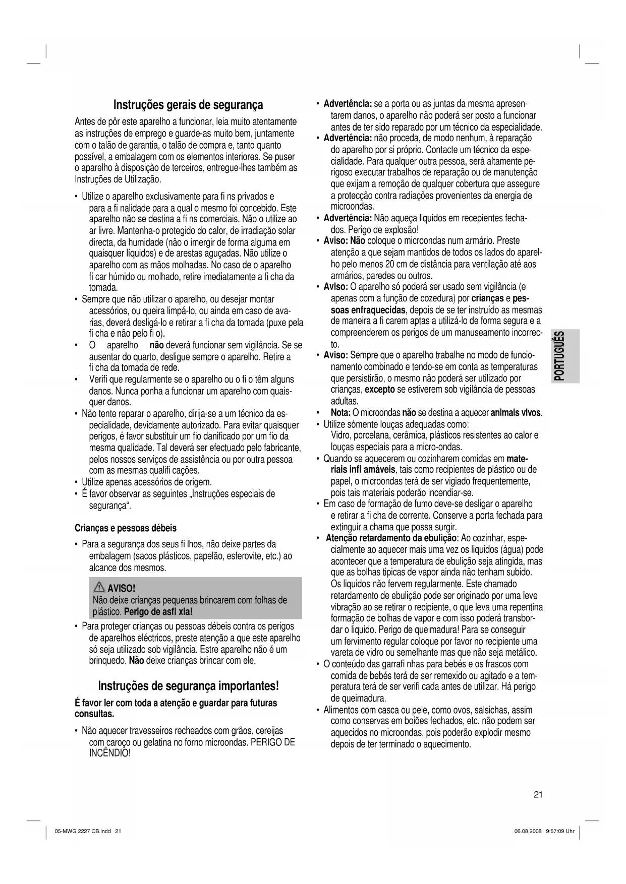- Alimentos com casca ou pele, como ovos, salsichas, assim como conservas em boiões fechados, etc. não podem ser aquecidos no microondas, pois poderão explodir mesmo depois de ter terminado o aquecimento. 05-MWG 2227 CB.indd 2105-MWG 2227 CB.indd 21 06.08.2008 9:57:09 Uhr06.08.2008 9:57:09 Uhr22 PORTUGUÊS PORTUGUÊS