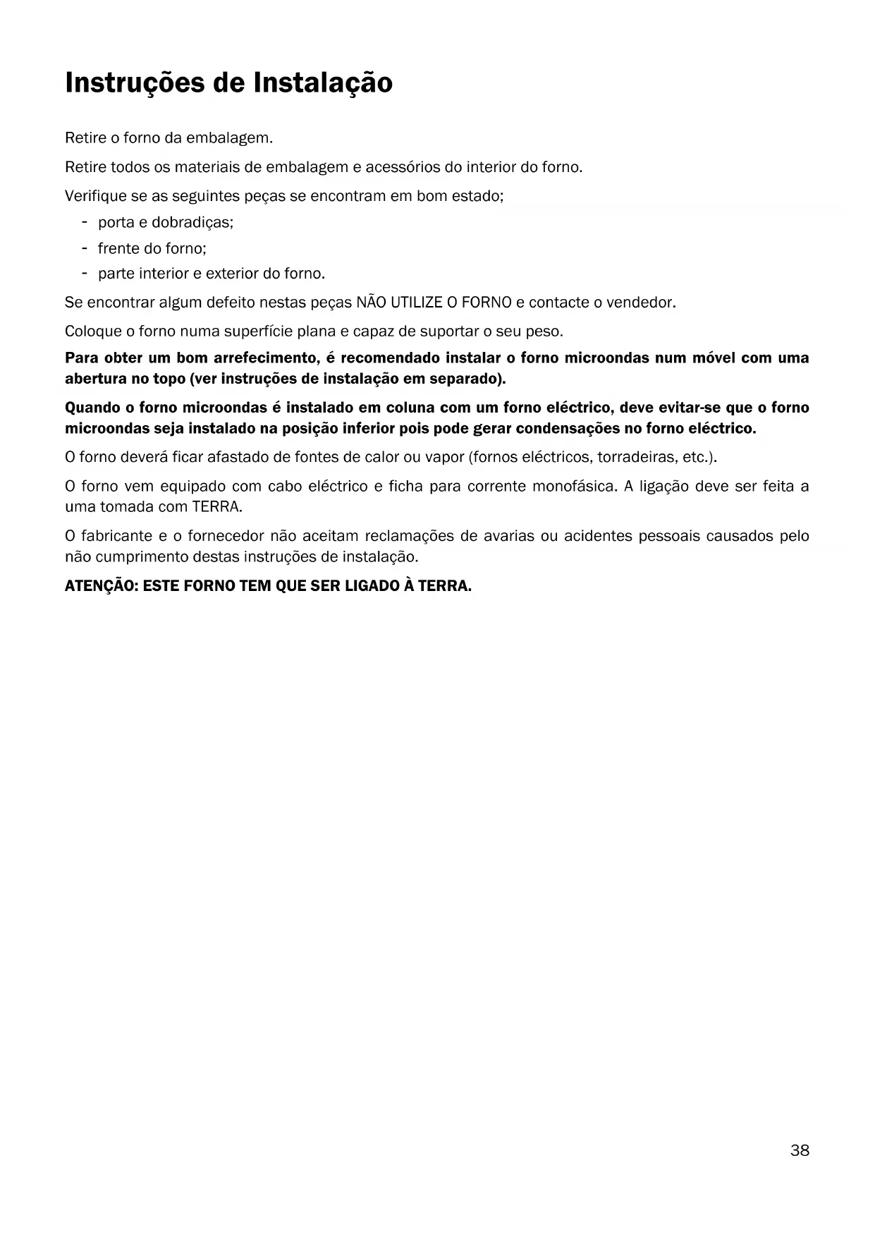 - Estimado Cliente: Antes de mais, queremos agradecer-lhe a preferência pelo nosso produto. Estamos certos que este forno Microondas moderno, funcional e prático, fabricado com materiais de primeira qualidade, irá satisfazer as suas expectativas. Solicitamos uma leitura atenta das instruções que constam deste livro e do folheto anexo, as quais lhe irão possibilitar obter um melhor resultado na utilização do seu forno Microondas. CONSERVE A DOCUMENTAÇÃO DESTE PRODUTO PARA CONSULTA FUTURA.37 Índice Instruções de Instalação p. 38