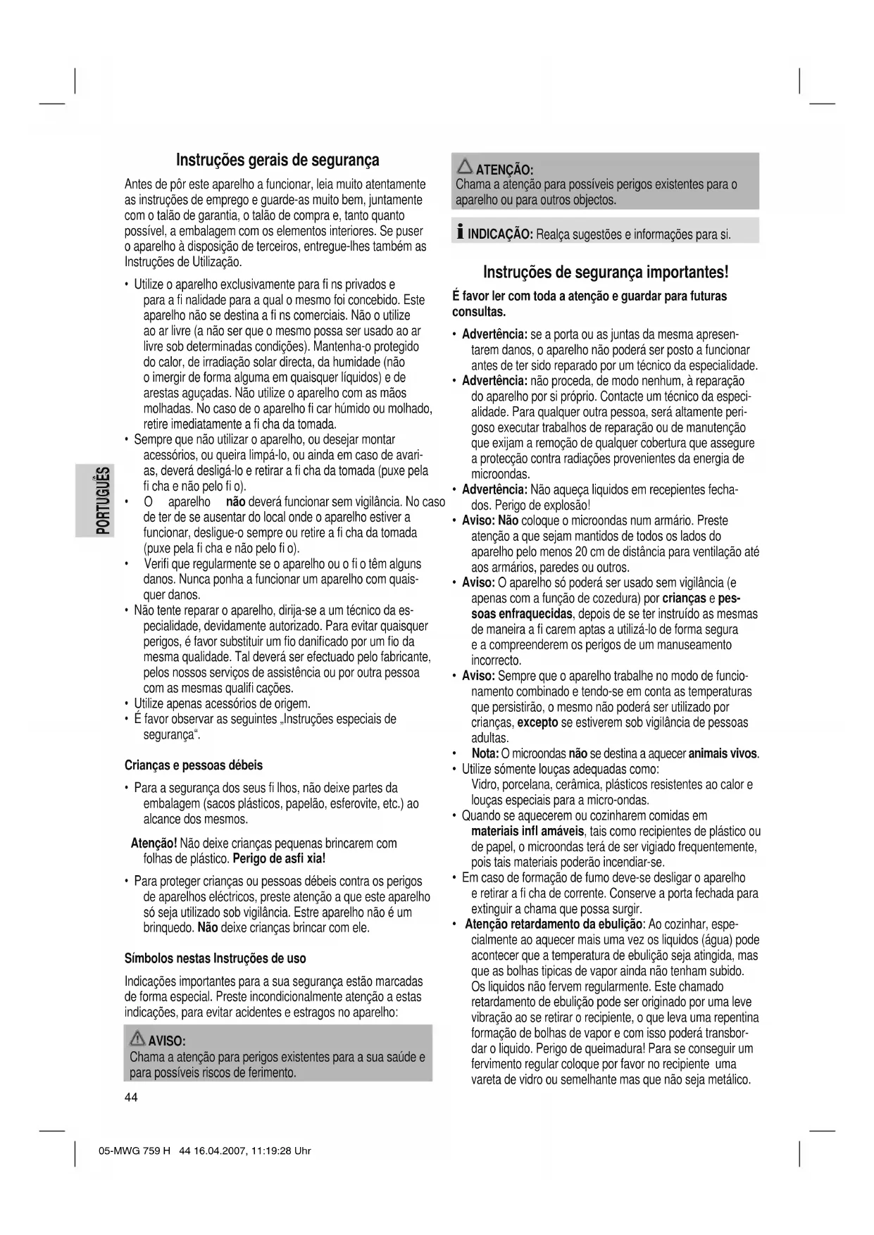 - Atenção retardamento da ebulição: Ao cozinhar, espe- cialmente ao aquecer mais uma vez os liquidos (água) pode acontecer que a temperatura de ebulição seja atingida, mas que as bolhas tipicas de vapor ainda não tenham subido. Os liquidos não fervem regularmente. Este chamado retardamento de ebulição pode ser originado por uma leve vibração ao se retirar o recipiente, o que leva uma repentina formação de bolhas de vapor e com isso poderá transbor- dar o liquido. Perigo de queimadura! Para se conseguir um fervimento regular coloque por favor no recipiente uma vareta de vidro ou semelhante mas que não seja metálico. 05-MWG 759 H 44 16.04.2007, 11:19:28 UhrPORTUGUÊS