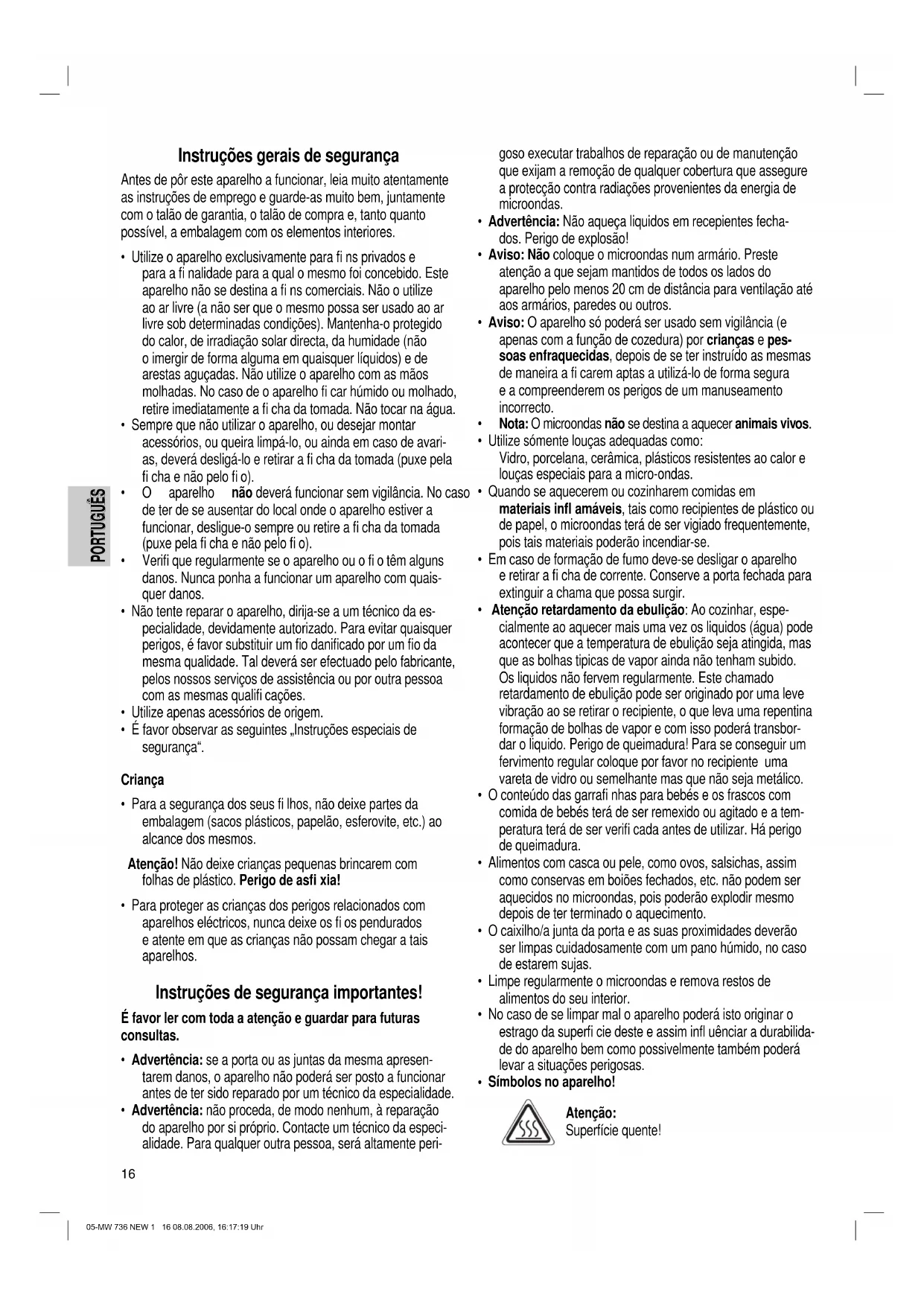 - Para proteger as crianças dos perigos relacionados com aparelhos eléctricos, nunca deixe os fi os pendurados e atente em que as crianças não possam chegar a tais aparelhos. Instruções de segurança importantes! É favor ler com toda a atenção e guardar para futuras consultas.
