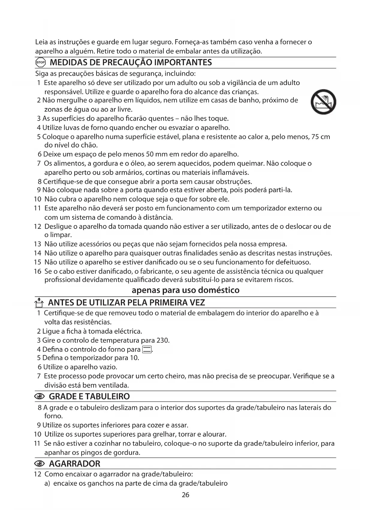 Siga as precauções básicas de segurança, incluindo: 1 Este aparelho só deve ser utilizado por um adulto ou sob a vigilância de um adulto responsável. Utilize e guarde o aparelho fora do alcance das crianças. 2 Não mergulhe o aparelho em líquidos, nem utilize em casas de banho, próximo de zonas de água ou ao ar livre. 3 As superfícies do aparelho ficarão quentes – não lhes toque. 4 Utilize luvas de forno quando encher ou esvaziar o aparelho. 5 Coloque o aparelho numa superfície estável, plana e resistente ao calor a, pelo menos, 75 cm do nível do chão. 6 Deixe um espaço de pelo menos 50 mm em redor do aparelho. 7 Os alimentos, a gordura e o óleo, ao serem aquecidos, podem queimar. Não coloque o aparelho perto ou sob armários, cortinas ou materiais inflamáveis. 8 Certifique-se de que consegue abrir a porta sem causar obstruções. 9 Não coloque nada sobre a porta quando esta estiver aberta, pois poderá parti-la. 10 Não cubra o aparelho nem coloque seja o que for sobre ele. 11 Este aparelho não deverá ser posto em funcionamento com um temporizador externo ou com um sistema de comando à distância. 12 Desligue o aparelho da tomada quando não estiver a ser utilizado, antes de o deslocar ou de o limpar. 13 Não utilize acessórios ou peças que não sejam fornecidos pela nossa empresa. 14 Não utilize o aparelho para quaisquer outras finalidades senão as descritas nestas instruções. 15 Não utilize o aparelho se estiver danificado ou se o seu funcionamento for defeituoso. 16 Se o cabo estiver danificado, o fabricante, o seu agente de assistência técnica ou qualquer profissional devidamente qualificado deverá substituí-lo para se evitarem riscos. apenas para uso doméstico U ANTES DE UTILIZAR PELA PRIMEIRA VEZ 1 Certifique-se de que removeu todo o material de embalagem do interior do aparelho e à volta das resistências. 2 Ligue a ficha à tomada eléctrica. 3 Gire o controlo de temperatura para 230. 4 Defina o controlo do forno para H. 5 Defina o temporizador para 10. 6 Utilize o aparelho vazio. 7 Este processo pode provocar um certo cheiro, mas não precisa de se preocupar. Verifique se a divisão está bem ventilada.