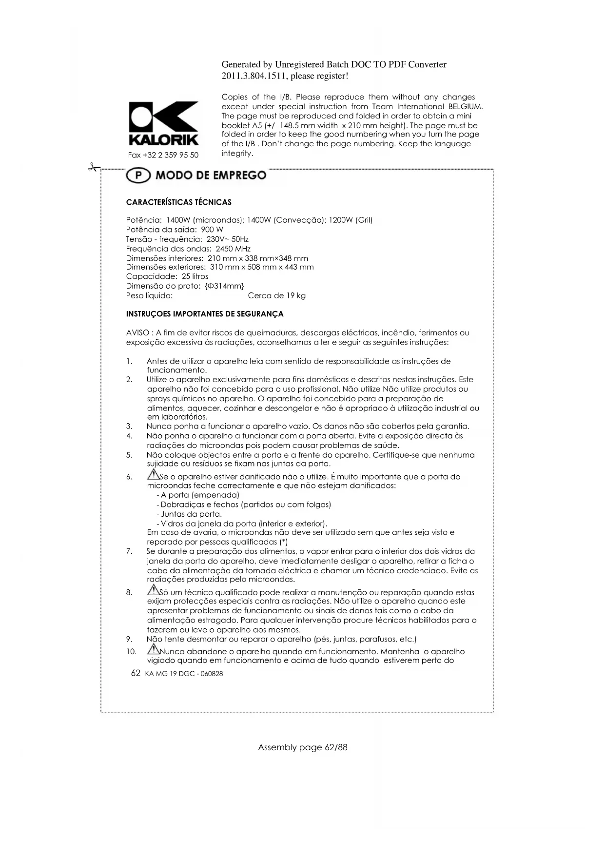 aparelho se a lâmpada de iluminação do interior do microondas tiver de ser substituída. PROTECÇÃO DO MEIO AMBIENTE – DIRECTIVA 2002/96/CE Para a preservação do ambiente e da nossa saúde, a eliminação no fim da vida útil dos aparelhos eléctricos e electrónicos, deve-se efectuar no cumprimento das legislações em vigor e pela participação de todos quer sejam produtores ou utilizadores. É por esta razão que o vosso aparelho tem na placa sinalética o símbolo , informando que em caso algum o aparelho deve ser colocado no caixote do lixo camarário ou privado para que não vá para as lixeiras comuns mas sim devolvido ao revendedor ou depositado nos locais apropriados e identificados para a recolha destes aparelhos para que uma vez recolhidos sejam reciclados, reutilizados ou lhe sejam dados outras aplicações.Generated by Unregistered Batch DOC TO PDF Converter 2011.3.804.1511, please register! Copies of the I/B. Please reproduce them without any changes except under special instruction from Team International BELGIUM. The page must be reproduced and folded in order to obtain a mini booklet A5 (+/- 148.5 mm width x 210 mm height). The page must be folded in order to keep the good numbering when you turn the page of the I/B . Don‟t change the page numbering. Keep the language integrity.