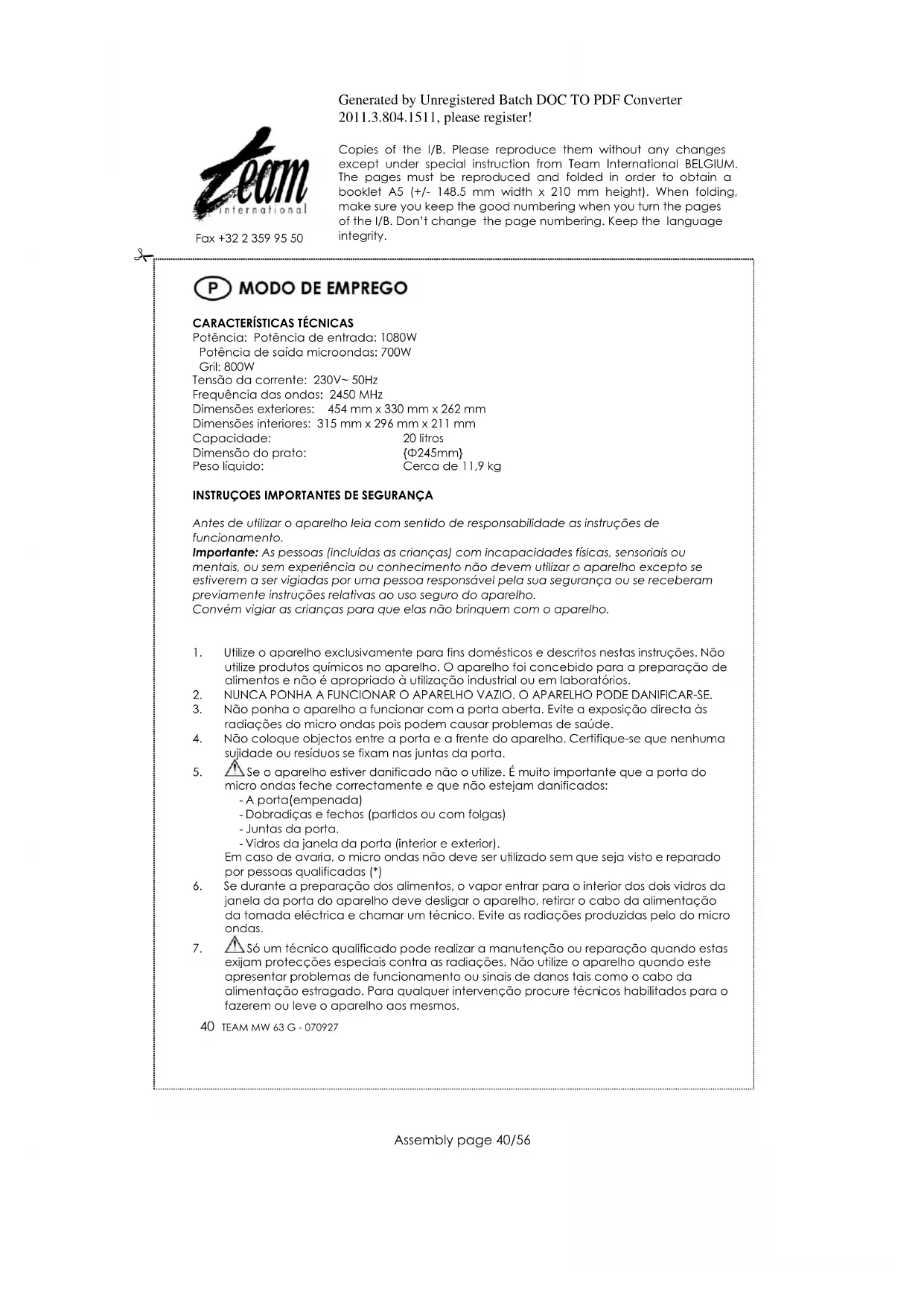 aparelho se a lâmpada de iluminação do interior do micro ondas tiver de ser substituída. PROTECÇÃO DO MEIO AMBIENTE – DIRECTIVA 2002/96/CE Para a preservação do ambiente e da nossa saúde, a eliminação no fim da vida útil dos aparelhos eléctricos e electrónicos, deve-se efectuar no cumprimento das legislações em vigor e pela participação de todos quer sejam produtores ou utilizadores. É por esta razão que o vosso aparelho tem na placa sinalética o símbolo , informando que em caso algum o aparelho deve ser colocado no caixote do lixo camarário ou privado para que não vá para as lixeiras comuns mas sim devolvido ao revendedor ou depositado nos locais apropriados e identificados para a recolha destes aparelhos para que uma vez recolhidos sejam reciclados, reutilizados ou lhe sejam dados outras aplicações.Generated by Unregistered Batch DOC TO PDF Converter 2011.3.804.1511, please register! Copies of the I/B. Please reproduce them without any changes except under special instruction from Team International BELGIUM. The pages must be reproduced and folded in order to obtain a booklet A5 (+/- 148.5 mm width x 210 mm height). When folding, make sure you keep the good numbering when you turn the pages of the I/B. Don‟t change the page numbering. Keep the language integrity.