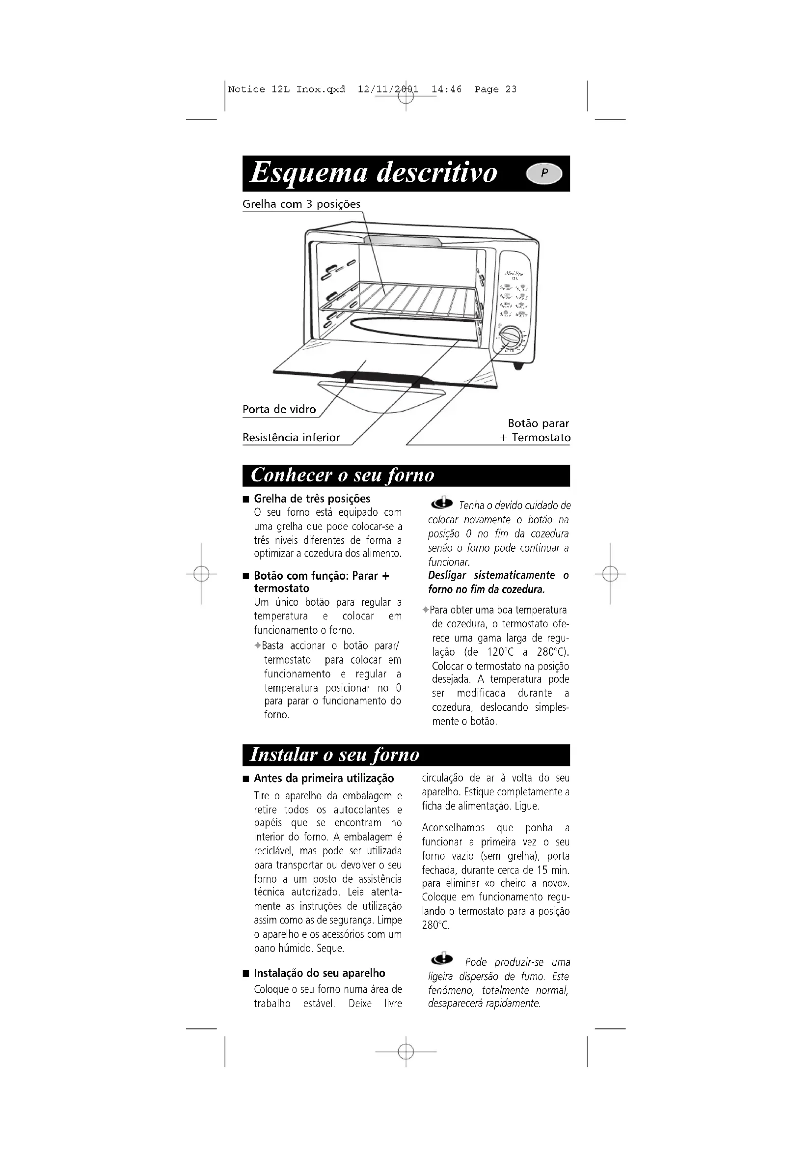 Aquecimentos uuuuuu Congelados uuuuuuu Peixes uuu Gratinar uuu Aves uuu Carnes uuuu Pastelaria uuuuuu Notice 12L Inox.qxd 12/11/2001 14:46 Page 24Instruções de segurança Consumo de energia (kWh) : Subida a 200° C : 0.07 Mantém a 200° C durante 1 hora : 0.37 TTOOTTAALL :: 00..4444 É melhor ler todas as instru- ções e consultar o seu «guia do utilizador».