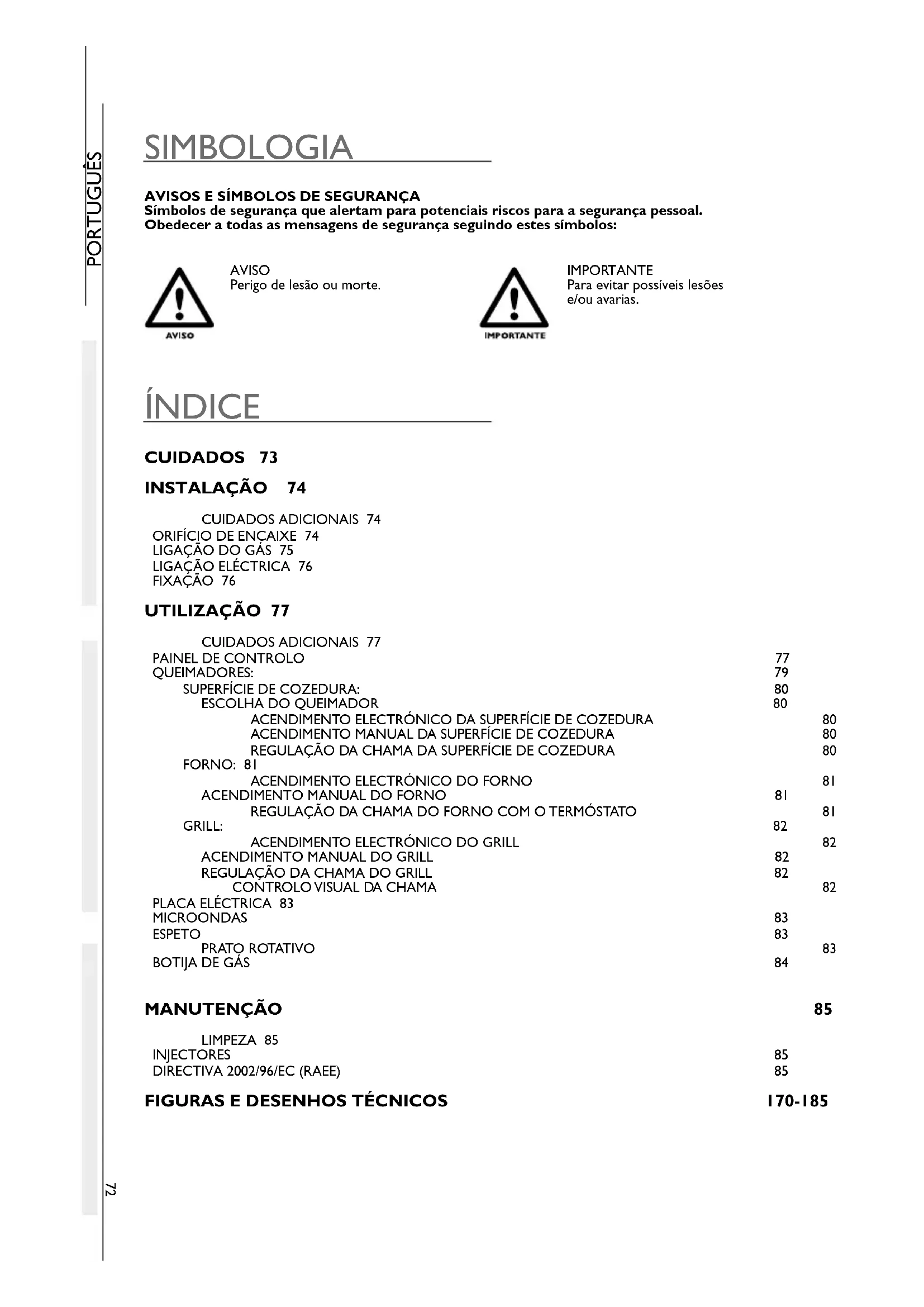 52 (CU351MK - CU354MK) 0,50 50AUXILIAR (Ø 47 mm)72 PORTUGUÊS SIMBOLOGIA AVISOS E SÍMBOLOS DE SEGURANÇA Símbolos de segurança que alertam para potenciais riscos para a segurança pessoal. Obedecer a todas as mensagens de segurança seguindo estes símbolos: ÍNDICE CUIDADOS 73 INSTALAÇÃO 74