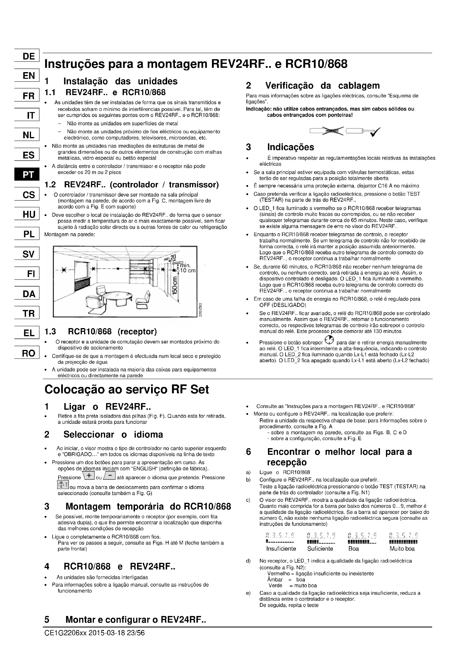 - Consulte as “Instruções para a montagem REV24RF.. e RCR10/868“· Monte ou configure o REV24RF.. na localização que preferir:Retire a unidade da respectiva chapa de base; para informações sobre oprocedimento, consulte a Fig. A - sobre a montagem na parede, consulte as Figs. B, C e D - sobre a configuração, consulte a Fig. E 6 Encontrar o melhor local para a recepção a) Ligue o RCR10/868 b) Configure o REV24RF.. na localização que preferir. Teste a ligação radioeléctrica pressionando o botão TEST (TESTAR) naparte de trás do controlador (consulte a Fig. N1) c) O visor do REV24RF.. mostra a qualidade da ligação radioeléctrica. Quanto mais comprida for a barra por baixo dos números 0…9, melhor éa qualidade da ligação radioeléctrica. Se a barra só aparecer por baixo donúmero 0, não existe nenhuma ligação radioeléctrica segura (consulte asinstruções de funcionamento) Insuficiente Suficiente Boa Muito boa d) No receptor, o LED_1 indica a qualidade da ligação radioeléctrica (consulte a Fig. N2): Vermelho = ligação insuficiente ou inexistente Âmbar = boa Verde = muito boa e) Caso a qualidade da ligação radioeléctrica seja insuficiente, reduza a distância entre o controlador e o receptor.De seguida, repita o teste