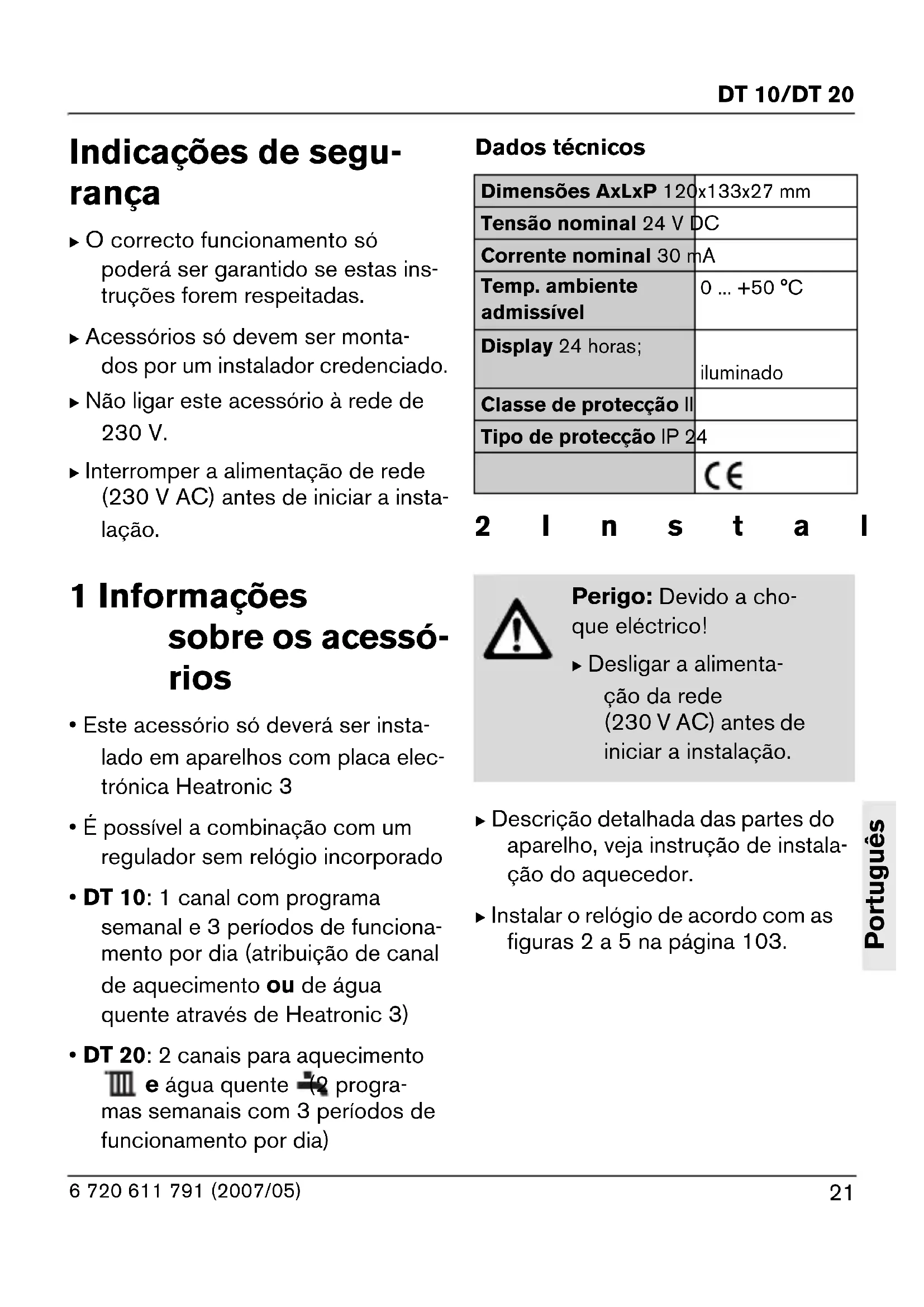 - DT 20: 2 canais para aquecimento e água quente (2 progra- mas semanais com 3 períodos de funcionamento por dia) Dados técnicos 2Instalação B Descrição detalhada das partes do aparelho, veja instrução de instala- ção do aquecedor. B Instalar o relógio de acordo com as figuras 2 a 5 na página 103. Dimensões AxLxP 120x133x27 mm Tensão nominal 24 V DC Corrente nominal 30 mA Temp. ambiente admissível 0 ... +50 °C Display 24 horas; iluminado Classe de protecção II Tipo de protecção IP 24 Perigo: Devido a cho- que eléctrico! B Desligar a alimenta- ção da rede (230 V AC) antes de iniciar a instalação.22 DT 10/DT 20 6 720 611 791 (2007/05) Português 3 Comando