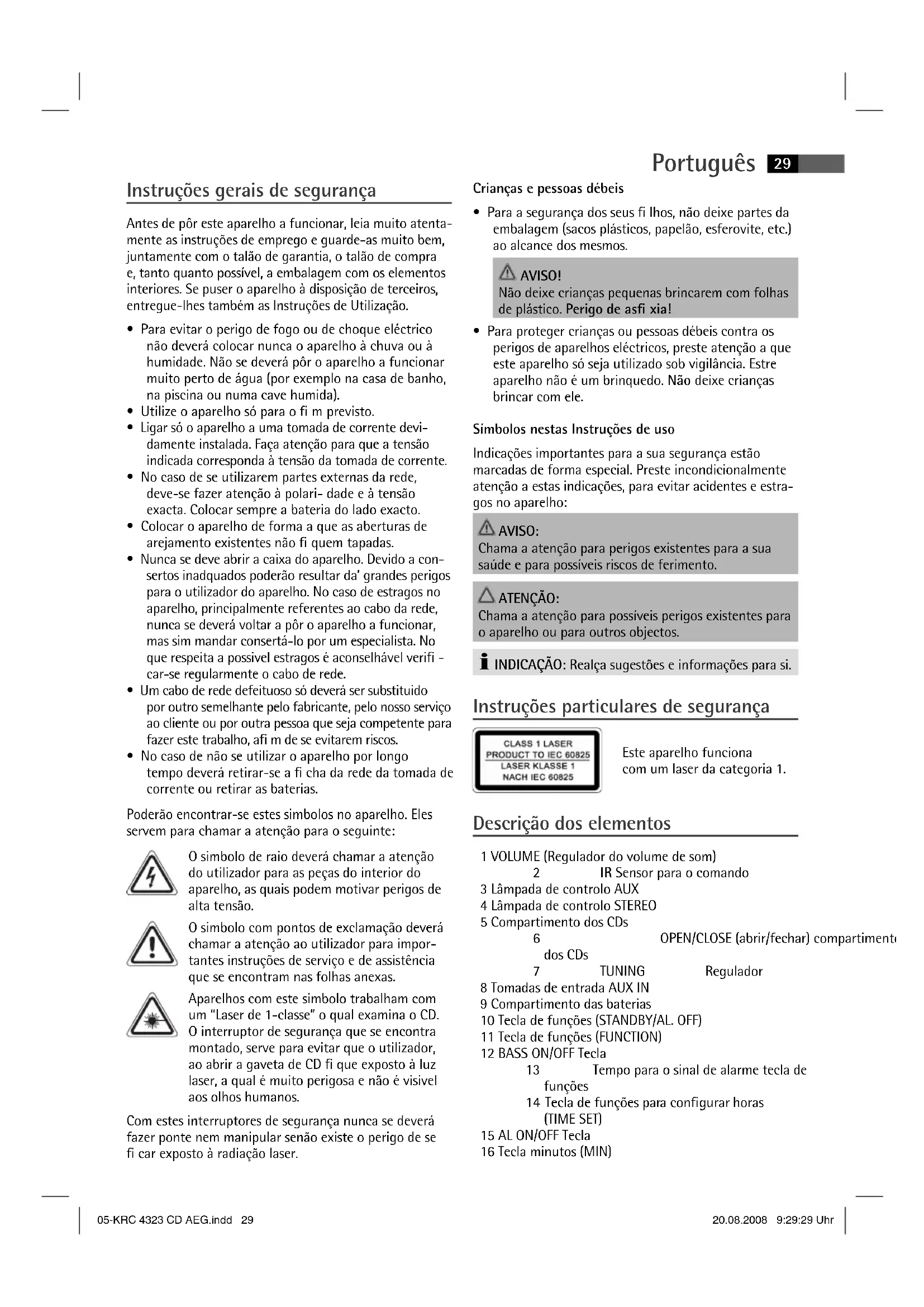 - Para proteger crianças ou pessoas débeis contra os perigos de aparelhos eléctricos, preste atenção a que este aparelho só seja utilizado sob vigilância. Estre aparelho não é um brinquedo. Não deixe crianças brincar com ele. Símbolos nestas Instruções de uso Indicações importantes para a sua segurança estão marcadas de forma especial. Preste incondicionalmente atenção a estas indicações, para evitar acidentes e estra- gos no aparelho: AVISO: Chama a atenção para perigos existentes para a sua saúde e para possíveis riscos de ferimento. ATENÇÃO: Chama a atenção para possíveis perigos existentes para o aparelho ou para outros objectos. INDICAÇÃO: Realça sugestões e informações para si. Instruções particulares de segurança Este aparelho funciona com um laser da categoria 1. Descrição dos elementos 1 VOLUME (Regulador do volume de som) 2 IR Sensor para o comando 3 Lâmpada de controlo AUX 4 Lâmpada de controlo STEREO 5 Compartimento dos CDs 6 OPEN/CLOSE (abrir/fechar) compartimento dos CDs 7 TUNING Regulador 8 Tomadas de entrada AUX IN 9 Compartimento das baterias 10 Tecla de funções (STANDBY/AL. OFF) 11 Tecla de funções (FUNCTION) 12 BASS ON/OFF Tecla 13 Tempo para o sinal de alarme tecla de funções 14 Tecla de funções para con gurar horas (TIME SET) 15 AL ON/OFF Tecla 16 Tecla minutos (MIN) 05-KRC 4323 CD AEG.indd 2905-KRC 4323 CD AEG.indd 29 20.08.2008 9:29:29 Uhr20.08.2008 9:29:29 UhrPortuguês