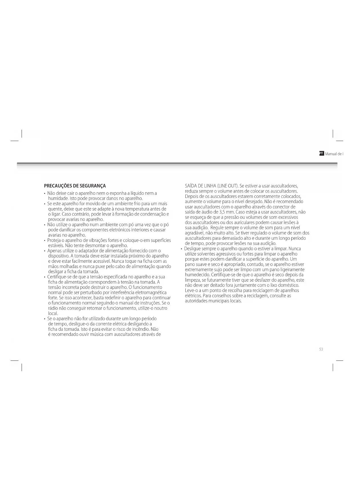 - Se o aparelho não for utilizado durante um longo período de tempo, desligue-o da corrente elétrica desligando a ficha da tomada. Isto é para evitar o risco de incêndio. Não é recomendado ouvir música com auscultadores através de SAÍDA DE LINHA (LINE OUT). Se estiver a usar auscultadores, reduza sempre o volume antes de colocar os auscultadores. Depois de os auscultadores estarem corretamente colocados, aumente o volume para o nível desejado. Não é recomendado usar auscultadores com o aparelho através do conector de saída de áudio de 3,5 mm. Caso esteja a usar auscultadores, não se esqueça de que a pressão ou volumes de som excessivos dos auscultadores ou dos auriculares podem causar lesões à sua audição. Regule sempre o volume de som para um nível agradável, não muito alto. Se tiver regulado o volume de som dos auscultadores para demasiado alto e durante um longo período de tempo, pode provocar lesões na sua audição.