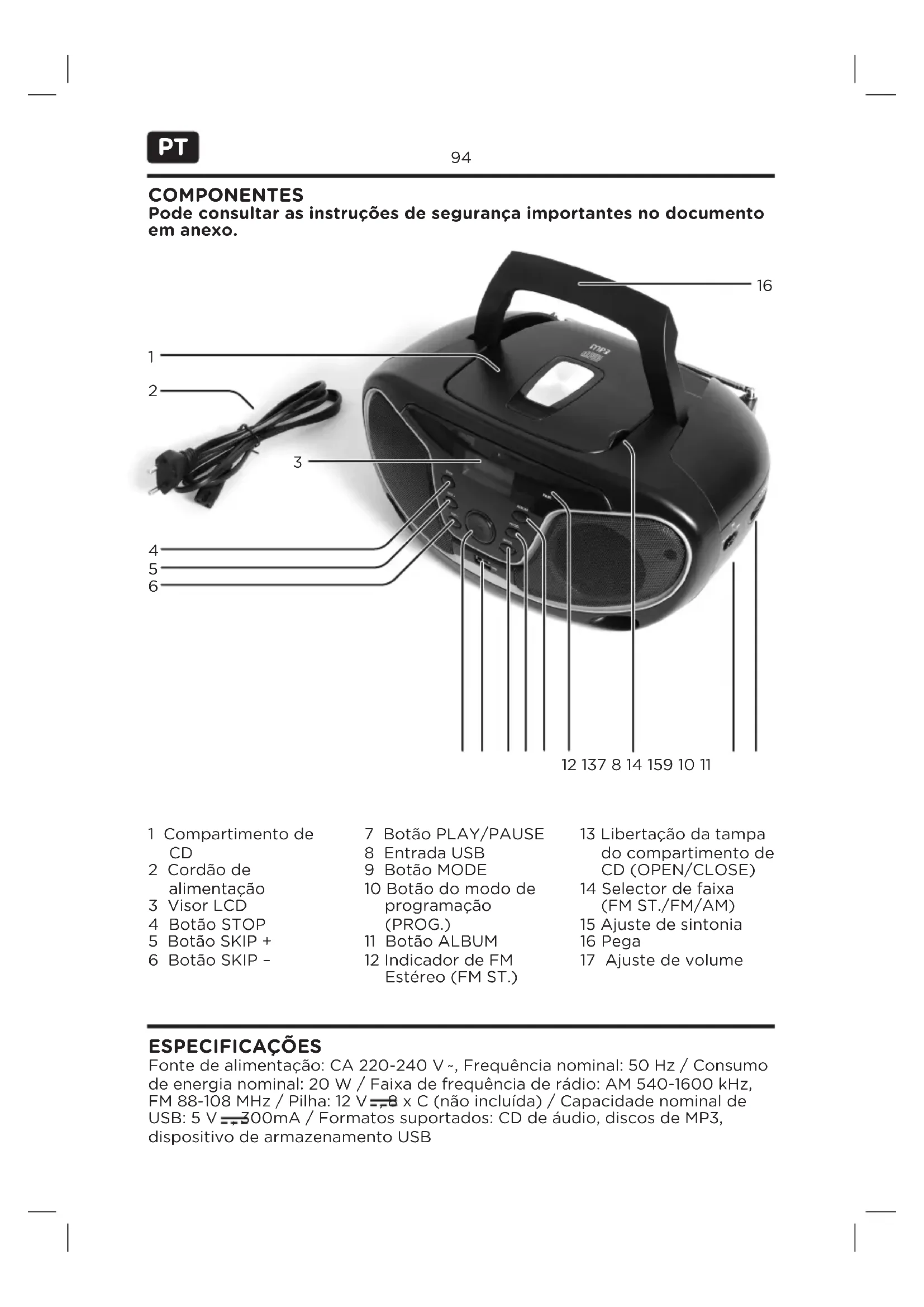 , Frequência nominal: 50 Hz / Consumo de energia nominal: 20 W / Faixa de frequência de rádio: AM 540-1600 kHz, FM 88-108 MHz / Pilha: 12 V , 8 x C (não incluída) / Capacidade nominal de USB: 5 V , 300mA / Formatos suportados: CD de áudio, discos de MP3, dispositivo de armazenamento USB ESPECIFICAÇÕES Pode consultar as instruções de segurança importantes no documento em anexo.