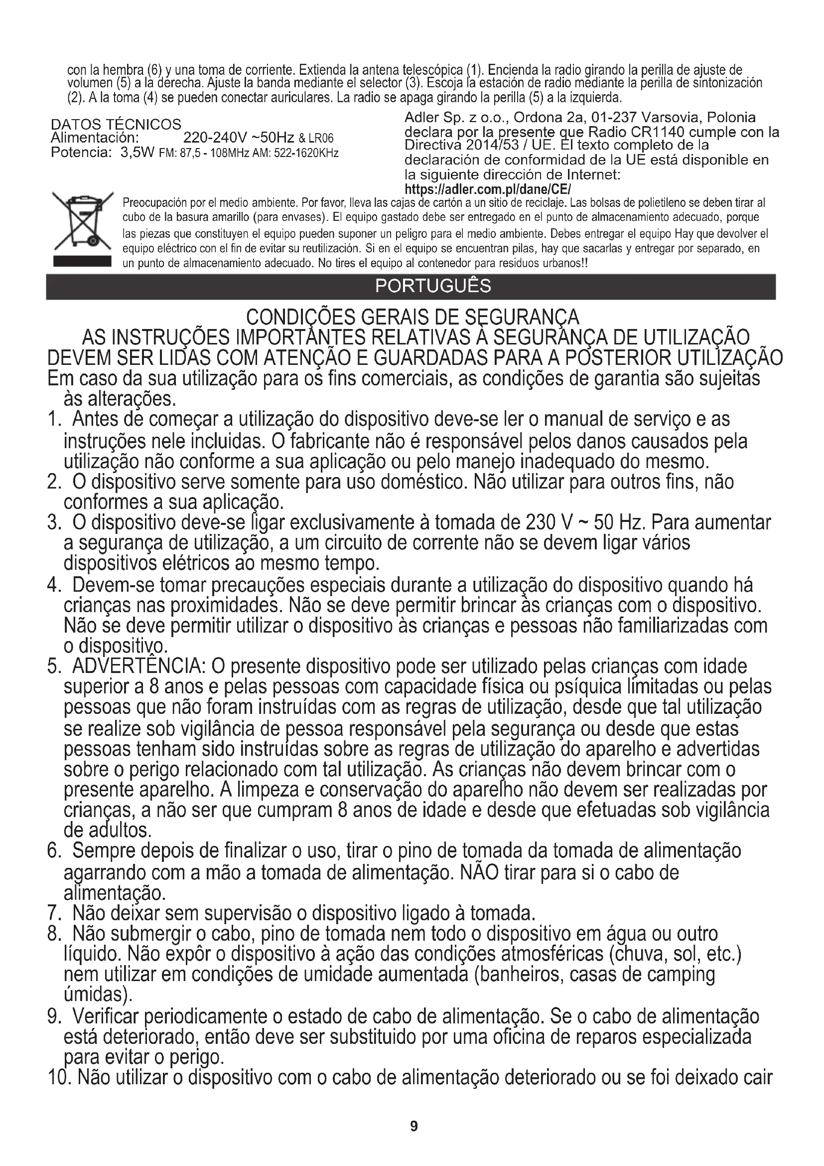 PORTUGUÊS Preocupación por el medio ambiente. Por favor, lleva las cajas de cartón a un sitio de reciclaje. Las bolsas de polietileno se deben tirar al cubo de la basura amarillo (para envases). El equipo gastado debe ser entregado en el punto de almacenamiento adecuado, porque las piezas que constituyen el equipo pueden suponer un peligro para el medio ambiente. Debes entregar el equipo Hay que devolver el equipo eléctrico con el fin de evitar su reutilización. Si en el equipo se encuentran pilas, hay que sacarlas y entregar por separado, en un punto de almacenamiento adecuado. No tires el equipo al contenedor para residuos urbanos!! Adler Sp. z o.o., Ordona 2a, 01-237 Varsovia, Polonia declara por la presente que Radio CR1140 cumple con la Directiva 2014/53 / UE. El texto completo de la declaración de conformidad de la UE está disponible en la siguiente dirección de Internet: https://adler.com.pl/dane/CE/10 ou foi deteriorado de qualquer outra maneira ou funciona de maneira incorreta. Não o dispositivo por conta própria porque existe perigo de choque eléctrico. O dispositivo deteriorado deve-se levar ao ponto de serviço técnico adequado para levar a cabo a verificação ou reparação. Todo tipo de reparações podem ser levadas a cabo somente pelos pontos de serviço técnico autorizados. A reparação realizada de maneira incorreta pode ser causa de grave perigo para o usuário.