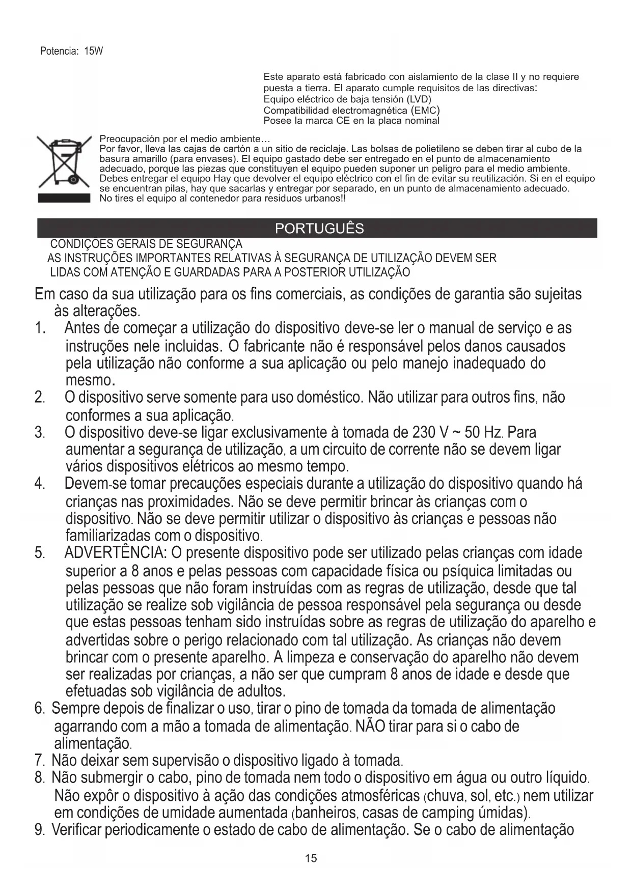 AS INSTRUÇÕES IMPORTANTES RELATIVAS À SEGURANÇA DE UTILIZAÇÃO DEVEM SER LIDAS COM ATENÇÃO E GUARDADAS PARA A POSTERIOR UTILIZAÇÃO Este aparato está fabricado con aislamiento de la clase II y no requiere puesta a tierra. El aparato cumple requisitos de las directivas: Equipo eléctrico de baja tensión (LVD) Compatibilidad electromagnética (EMC) Posee la marca CE en la placa nominal Em caso da sua utilização para os fins comerciais, as condições de garantia são sujeitas às alterações.