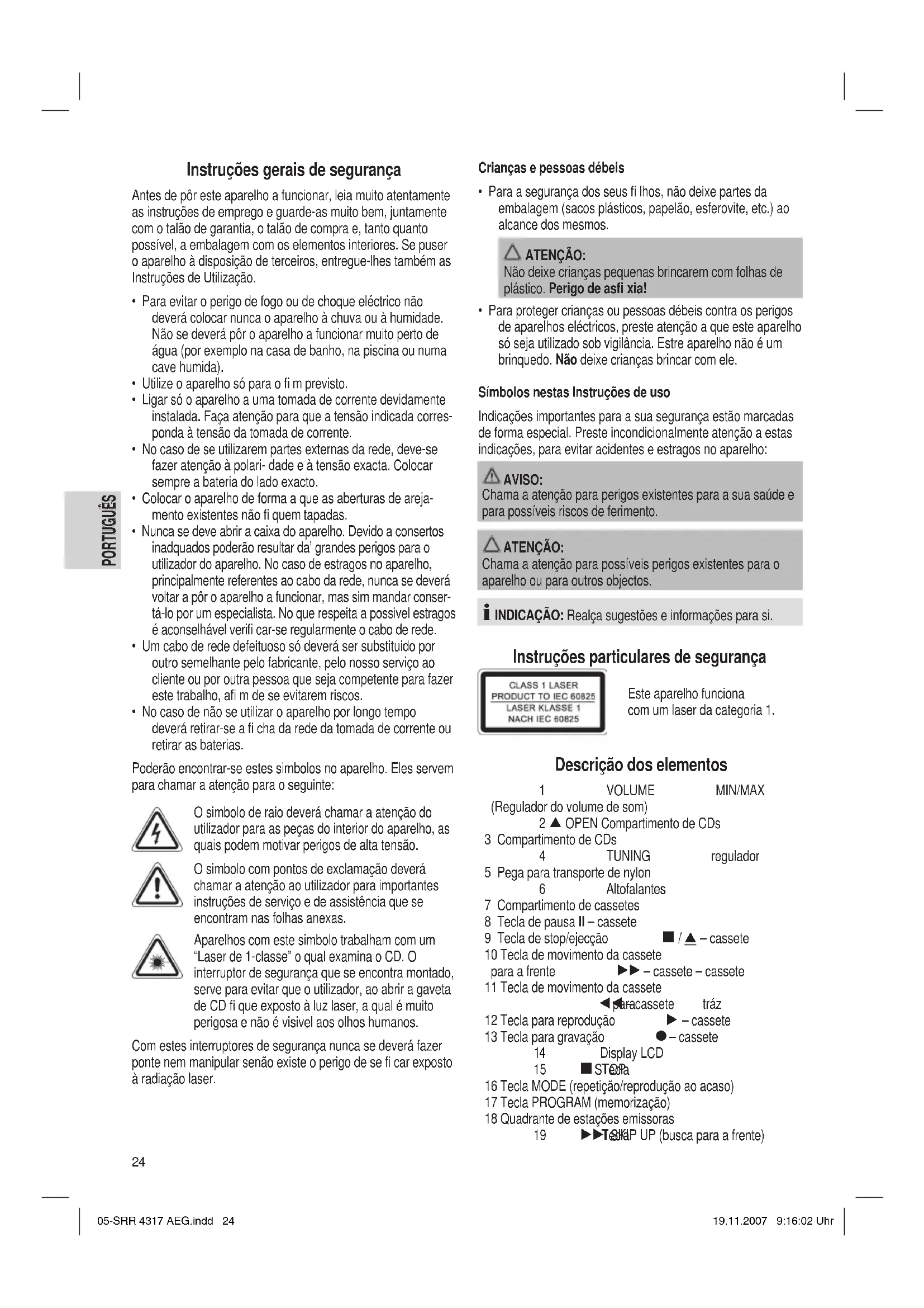 - Para proteger crianças ou pessoas débeis contra os perigos de aparelhos eléctricos, preste atenção a que este aparelho só seja utilizado sob vigilância. Estre aparelho não é um brinquedo. Não deixe crianças brincar com ele. Símbolos nestas Instruções de uso Indicações importantes para a sua segurança estão marcadas de forma especial. Preste incondicionalmente atenção a estas indicações, para evitar acidentes e estragos no aparelho: AVISO: Chama a atenção para perigos existentes para a sua saúde e para possíveis riscos de ferimento. ATENÇÃO: Chama a atenção para possíveis perigos existentes para o aparelho ou para outros objectos. INDICAÇÃO: Realça sugestões e informações para si. Instruções particulares de segurança Este aparelho funciona com um laser da categoria 1. Descrição dos elementos