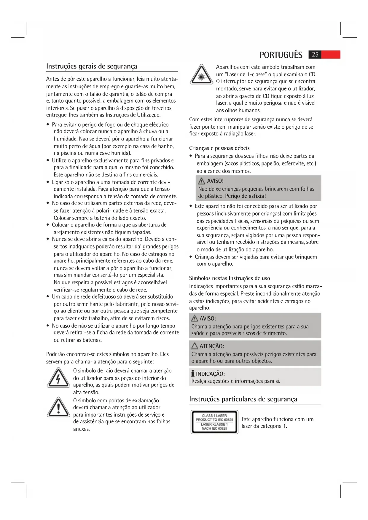 - No caso de não se utilizar o aparelho por longo tempo deverá retirar-se a cha da rede da tomada de corrente ou retirar as baterias. Poderão encontrar-se estes simbolos no aparelho. Eles servem para chamar a atenção para o seguinte: O simbolo de raio deverá chamar a atenção do utilizador para as peças do interior do aparelho, as quais podem motivar perigos de alta tensão. O simbolo com pontos de exclamação deverá chamar a atenção ao utilizador para importantes instruções de serviço e de assistência que se encontram nas folhas anexas. Aparelhos com este simbolo trabalham com um “Laser de 1-classe” o qual examina o CD. O interruptor de segurança que se encontra montado, serve para evitar que o utilizador, ao abrir a gaveta de CD que exposto à luz laser, a qual é muito perigosa e não é visivel aos olhos humanos. Com estes interruptores de segurança nunca se deverá fazer ponte nem manipular senão existe o perigo de se car exposto à radiação laser. Crianças e pessoas débeis