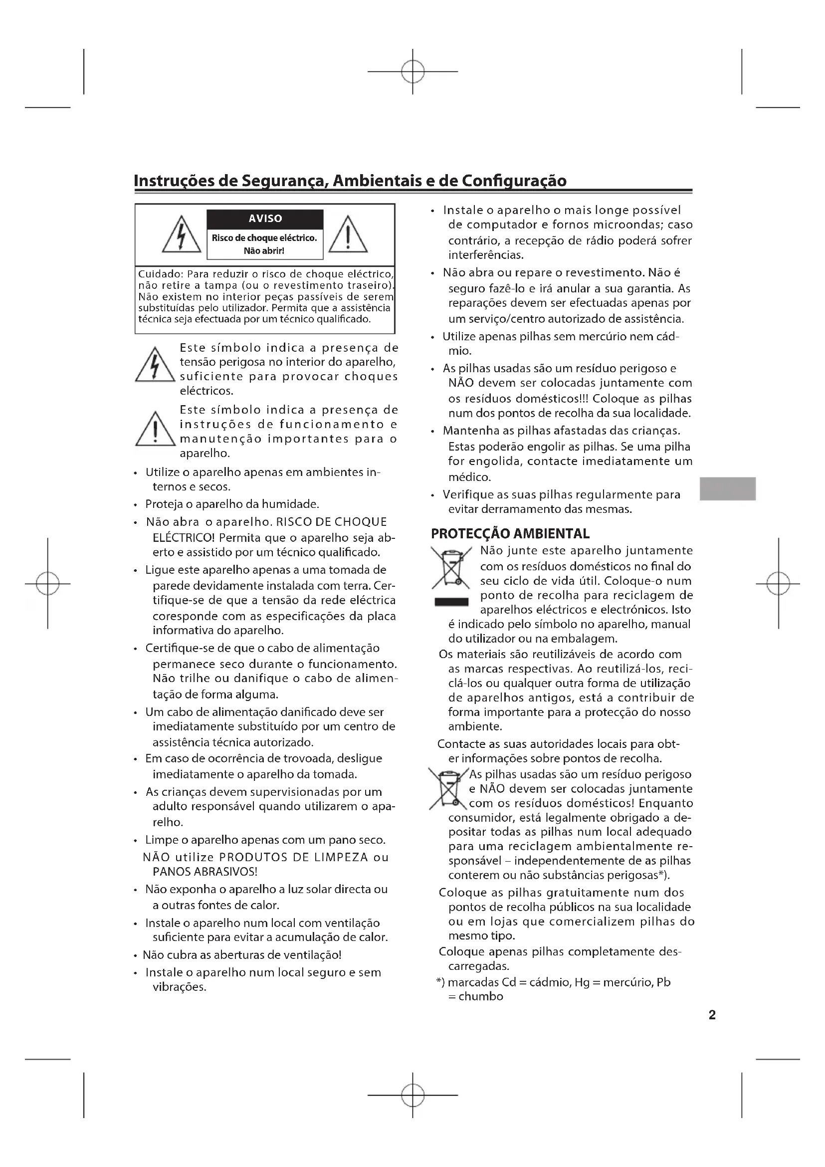 Cuidado: Para reduzir o risco deCHOque eletrico, nao retire a tampa ou revestamento traseiro). Nao existem no interior peças passiveis de serem substituidas pelo uso. Permita que a assistencia Tecnica sera efectuada por um technician especialico.
