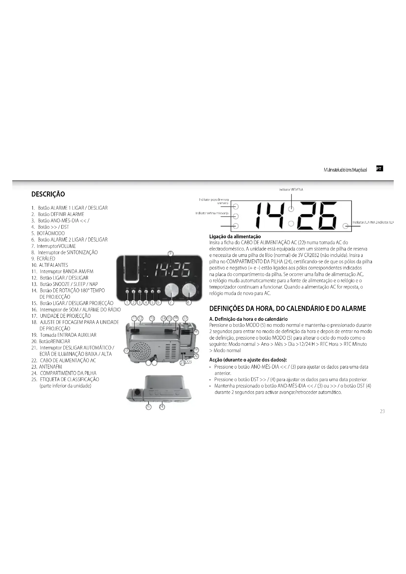 - Mantenha pressionado o botão ANO-MÊS-DIA << / (3) ou >> / o botão DST (4) durante 2 segundos para activar avançar/retroceder automático. DEFINIÇÃO DA SAÍDA DO ALARME E LIGAR / DESLIGAR O ALARME A. Definição da saída do alarme Defina o interruptor de SOM / RÁDIO ALARME (16) para a posição de rádio de modo a seleccionar o despertar por rádio ou o sinal sonoro para seleccionar acordar por som. Defina o Interruptor DESLIGAR AUTOMÁTICO / ECRÃ DE ILUMINAÇÃO BAIXA / ALTA (21) para a posição DESLIGAR AUTOMÁTICO (o ecrã desligará automaticamente em 15 segundos). Quando o alarme tocar, o ecrã ligará automaticamente de novo. B. Ligar / desligar o alarme Pressione o botão LIGAR /DESLIGAR ALARME 1 (1) para alternar entre ligar e desligar a função de saída do alarme. Pressione o botão LIGAR /DESLIGAR ALARME 2 (6) para alternar entre ligar e desligar a função de saída do alarme. Duração do alarme e função snooze A. Duração do alarme O alarme com som ou o alarme com rádio continuarão a tocar durante 30 minutos se nenhuma tecla for pressionada, depois parará automaticamente e aguardará pela hora do alarme no dia seguinte. B. Função snooze