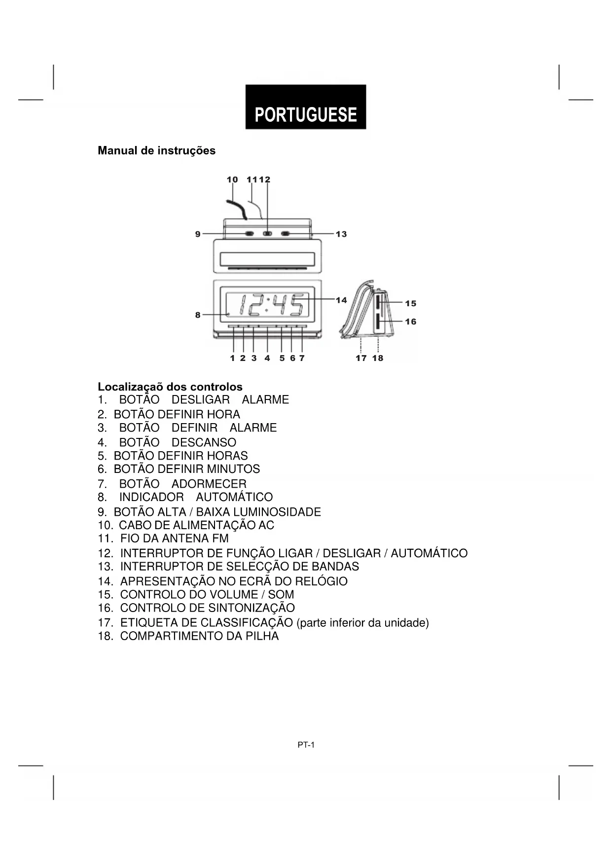 Ligação da alimentação Insira a fi cha do CABO DE ALIMENTAÇÃO AC (10) na tomada do electrodoméstico. Certifi que-se de que a tensão é a correcta por motivos de segurança e para prevenir danos plausíveis no aparelho. Coloque uma pilha de 9 Volts (não incluída) no local dos terminais da pilha no COMPARTIMENTO DA PILHA (18). A pilha mantém o relógio em funcionamento contínuo sempre que a alimentação AC é interrompida. Tenha em atenção que: O ecrã não apresentará a hora durante uma falha de alimentação, mas o relógio manterá a hora correcta. Funcionamento do rádio