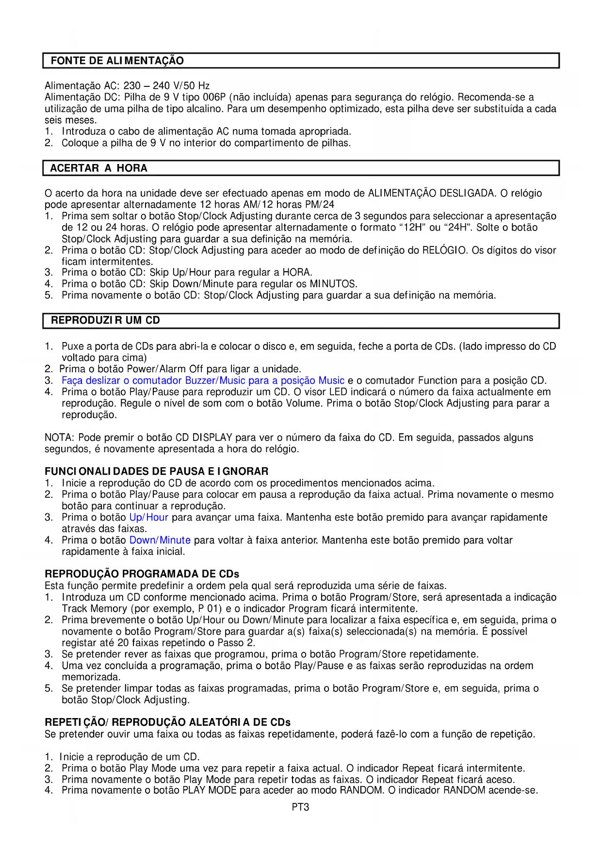 Alimentação AC: 230 – 240 V/50 Hz Alimentação DC: Pilha de 9 V tipo 006P (não incluída) apenas para segurança do relógio. Recomenda-se a utilização de uma pilha de tipo alcalino. Para um desempenho optimizado, esta pilha deve ser substituída a cada seis meses.