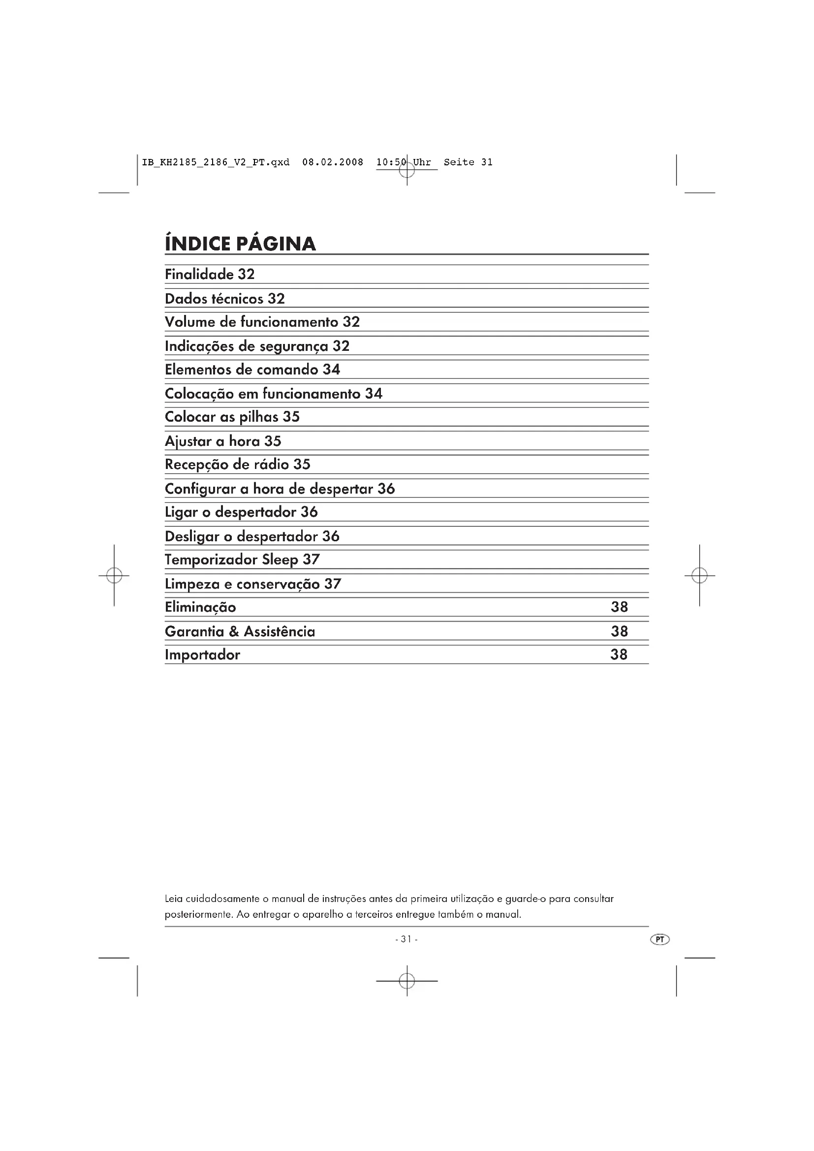 Finalidade 32 Dados técnicos 32 Volume de funcionamento 32 Indicações de segurança 32 Elementos de comando 34 Colocação em funcionamento 34 Colocar as pilhas 35 Ajustar a hora 35 Recepção de rádio 35 Configurar a hora de despertar 36 Ligar o despertador 36 Desligar o despertador 36 Temporizador Sleep 37 Limpeza e conservação 37 Eliminação 38 Garantia & Assistência 38 Importador 38 Leia cuidadosamente o manual de instruções antes da primeira utilização e guarde-o para consultar posteriormente. Ao entregar o aparelho a terceiros entregue também o manual. IB_KH2185_2186_V2_PT.qxd 08.02.2008 10:50 Uhr Seite 31- 32 -